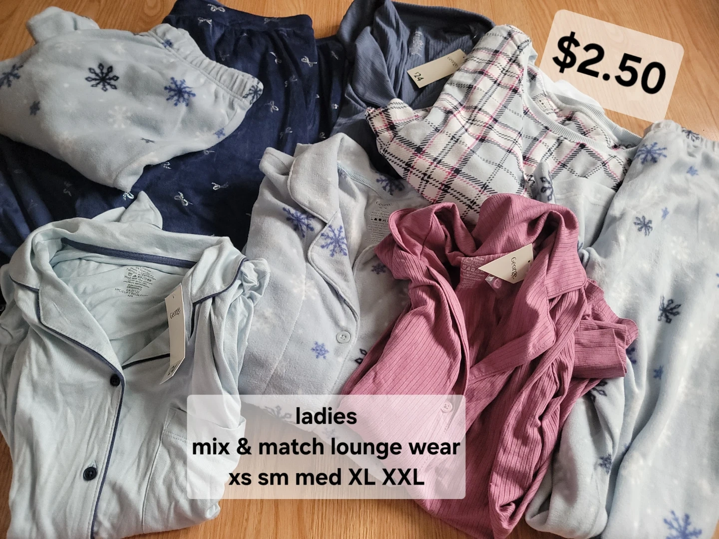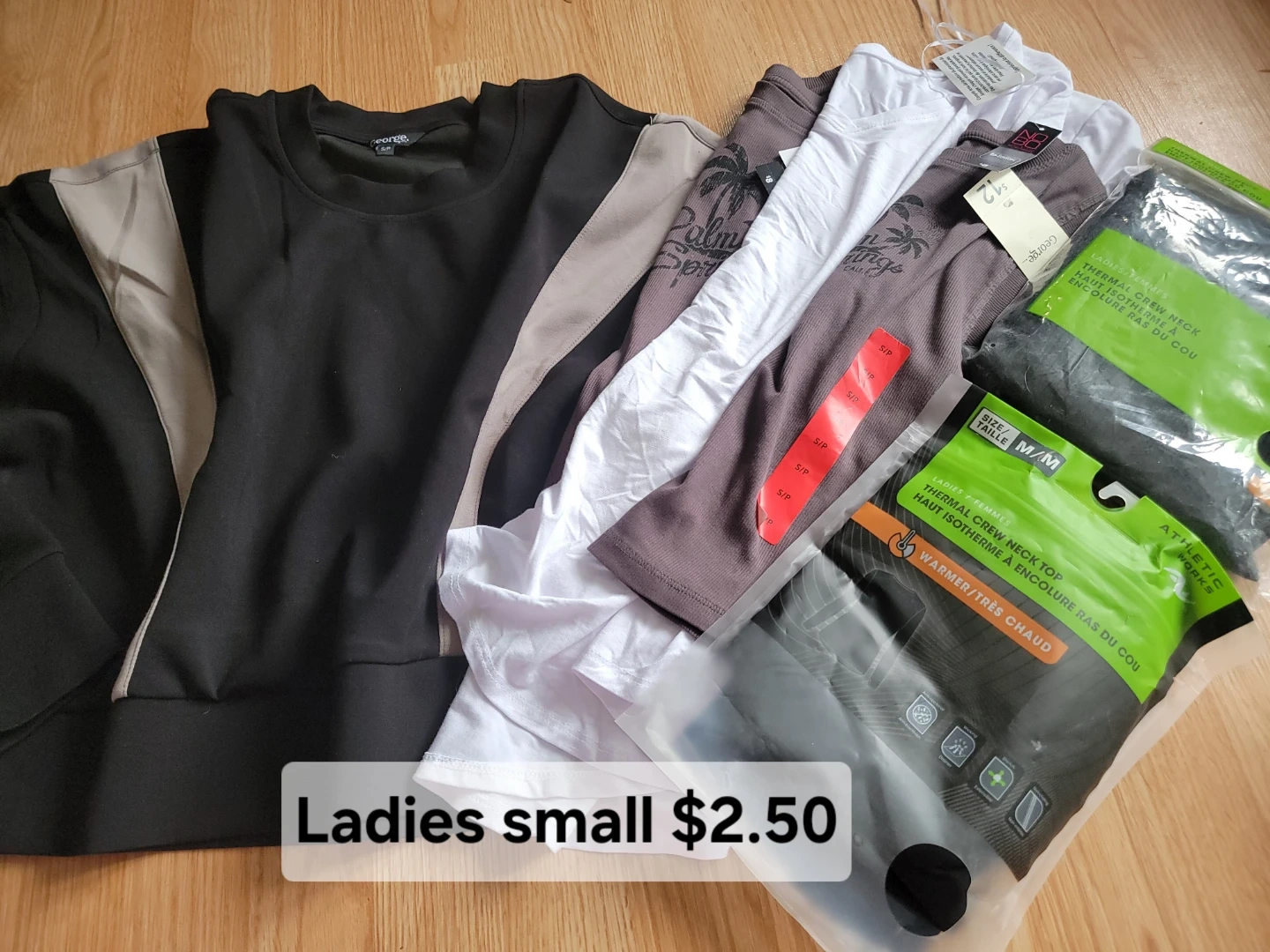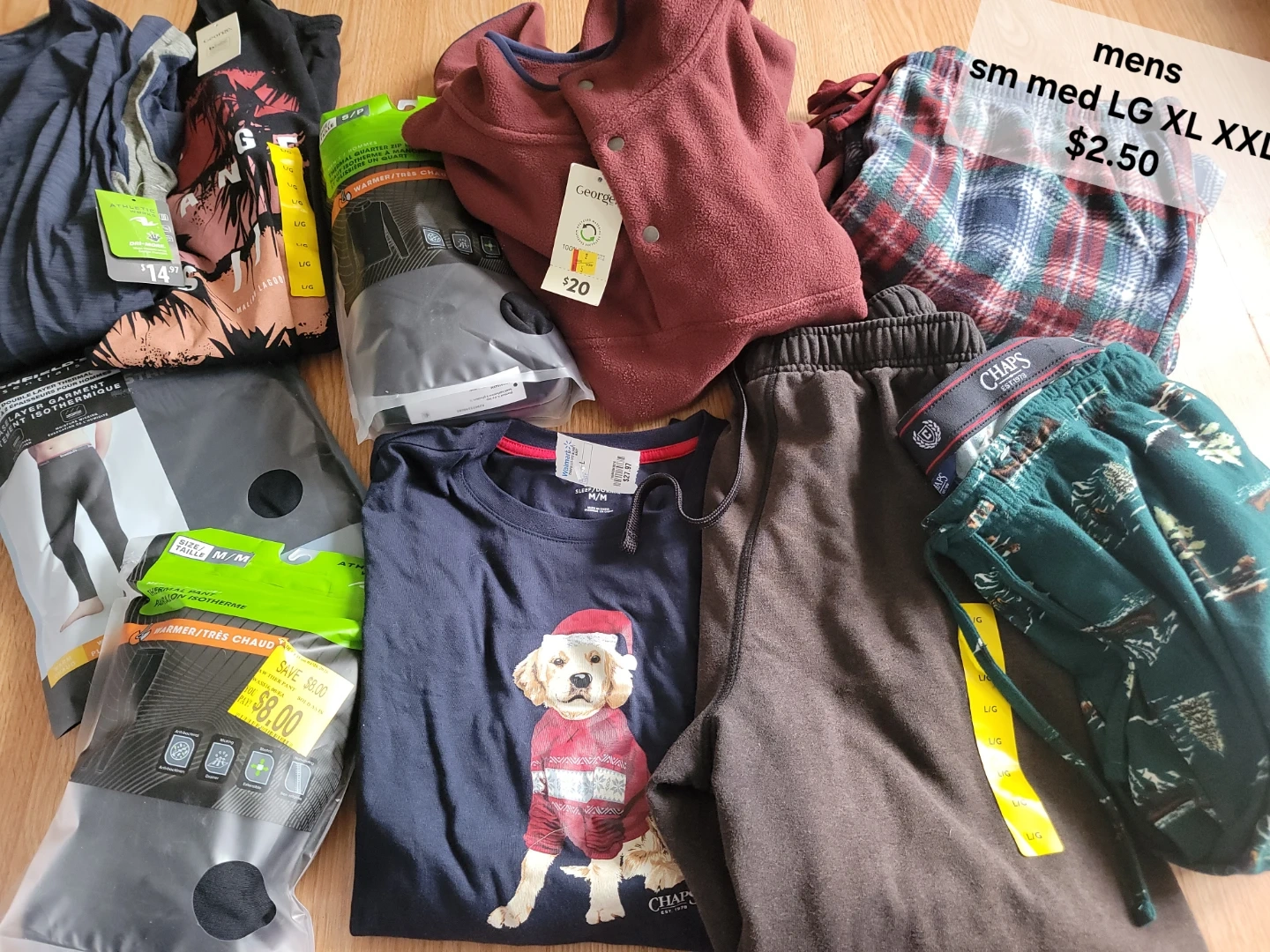 includes men's sizes sm, med, LG, XL, XXL and ladies sizes xs, sm, med, LG, XL, XXL. Clothing types vary from t-shirts, tanks, thermals, loungewear, and pyjamas. Most items still have tags attached.