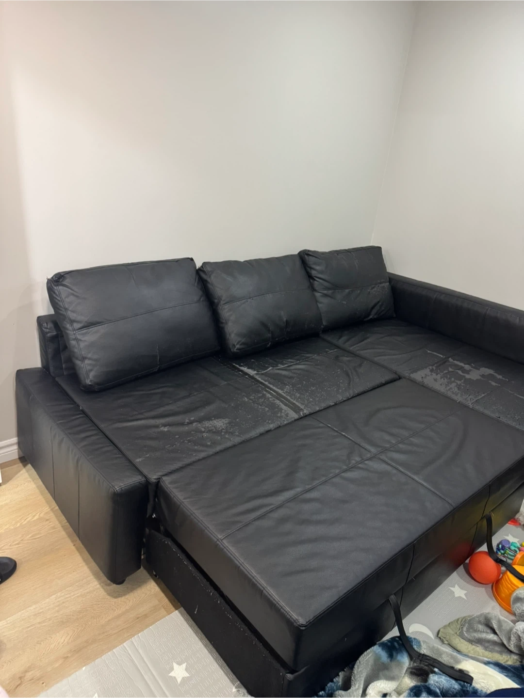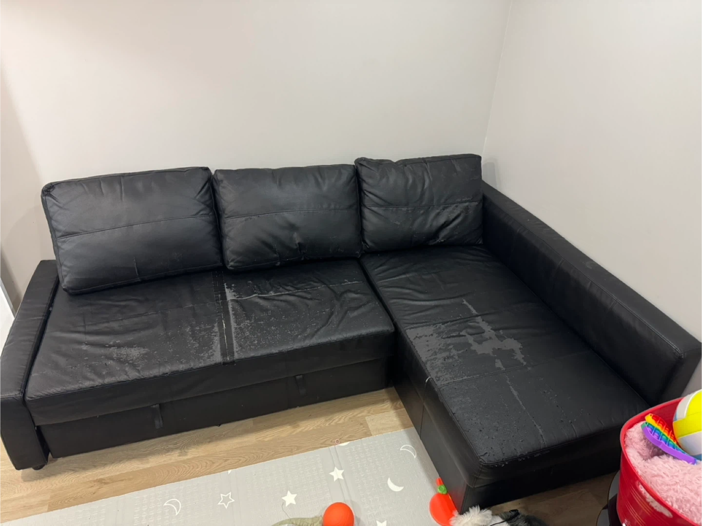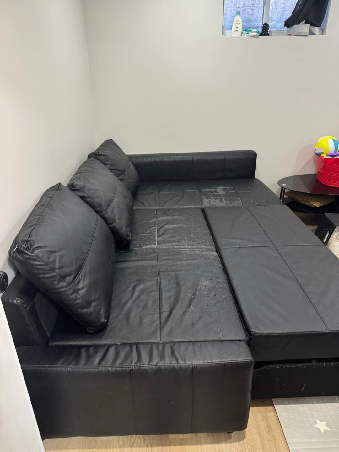 This is a black faux leather sectional sofa. It features a chaise lounge with built-in storage underneath. The material shows wear and peeling, especially on the seating areas. Some cushions are included.