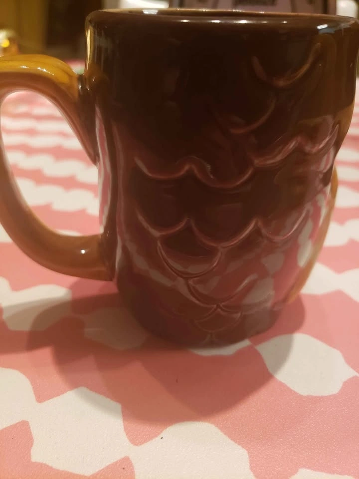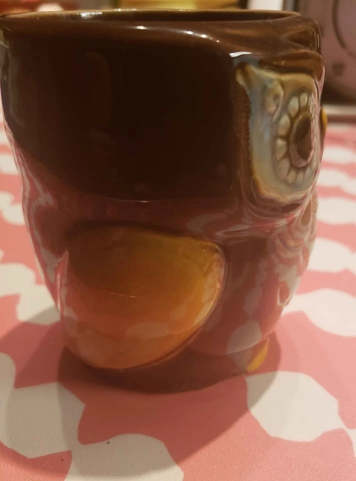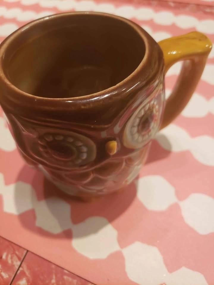 Cute little painted brown owl mug with green eyes and yellow wings and handle. 4 inches high. Hardly used, mostly stored in cupboard. No chips, cracks, or marks. Pretty colours and nice detail in the feathers and around the eyes.