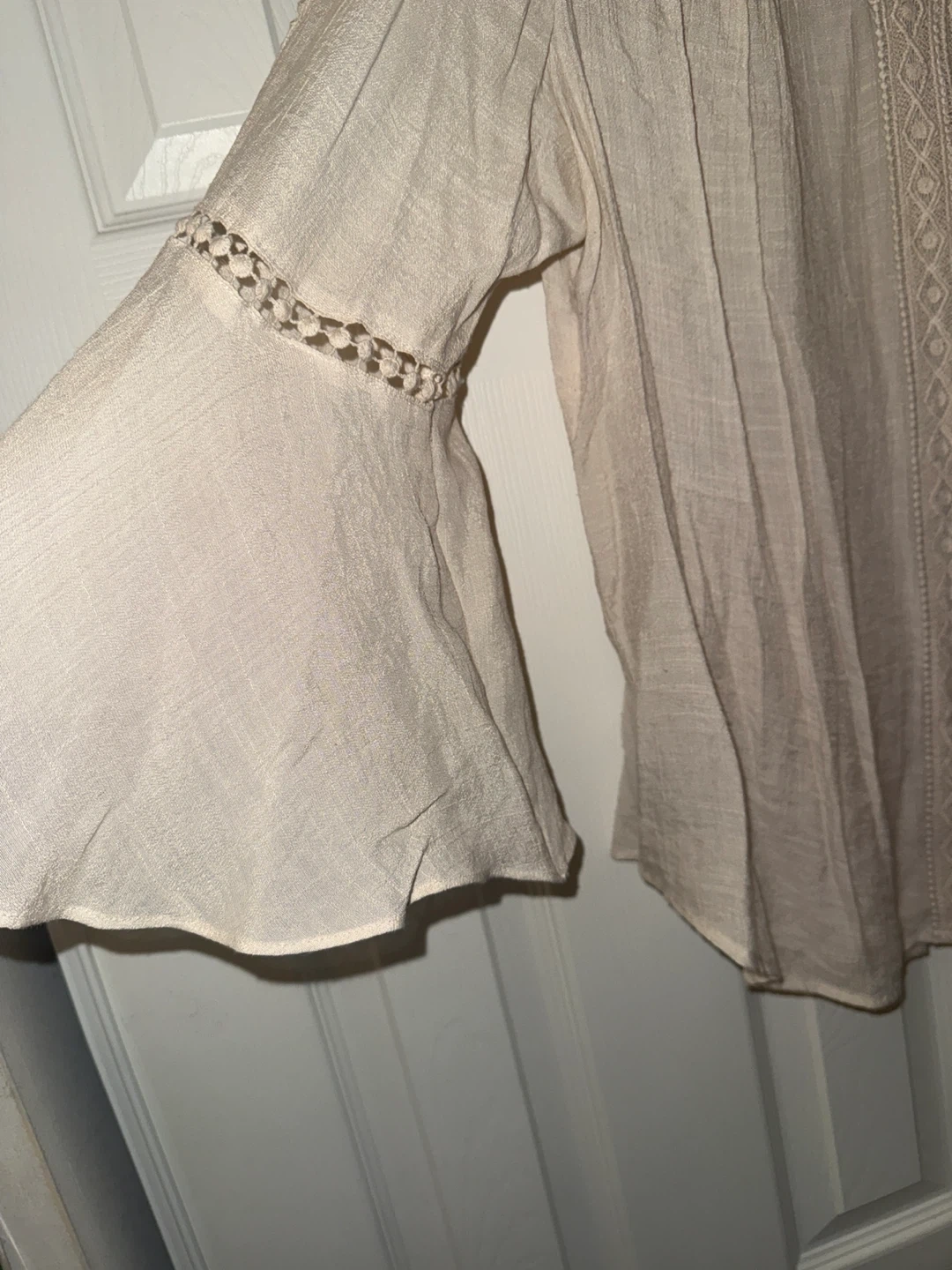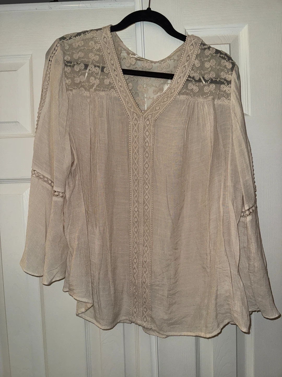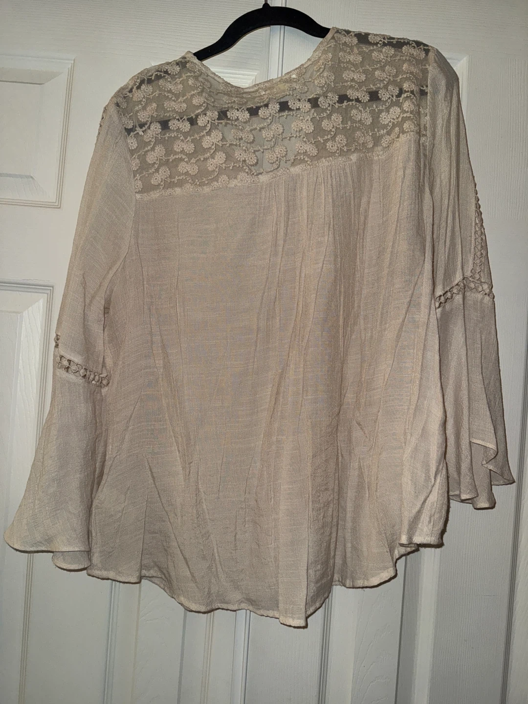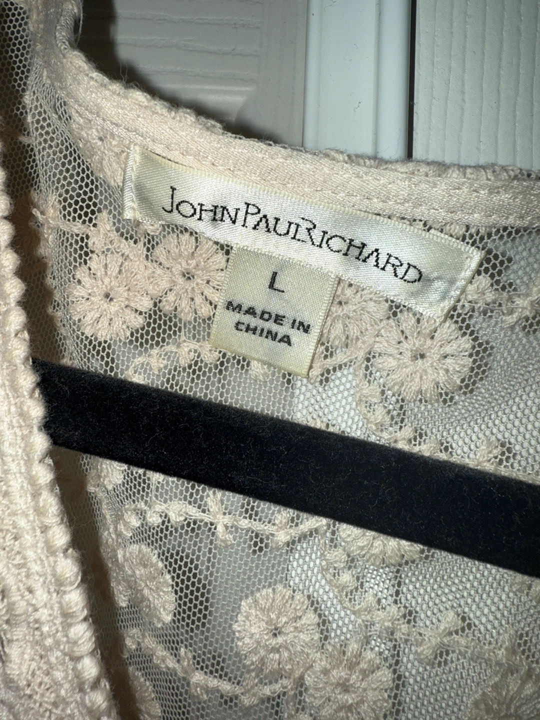 Selling a beautiful John Paul Richard blouse with delicate lace trim. It's a size large and in great condition. The flowy sleeves add a touch of elegance to this top! Perfect for dressing up or down