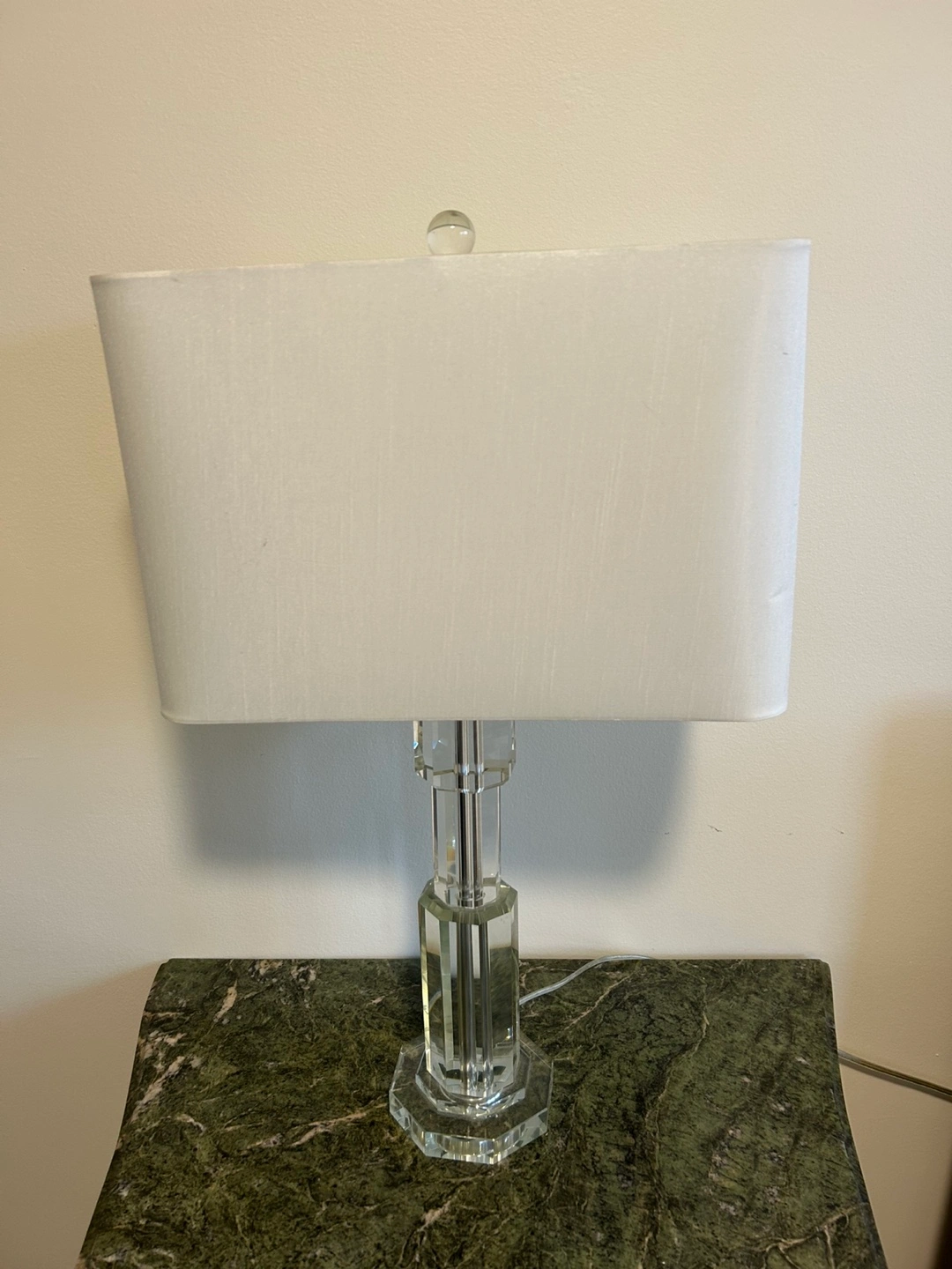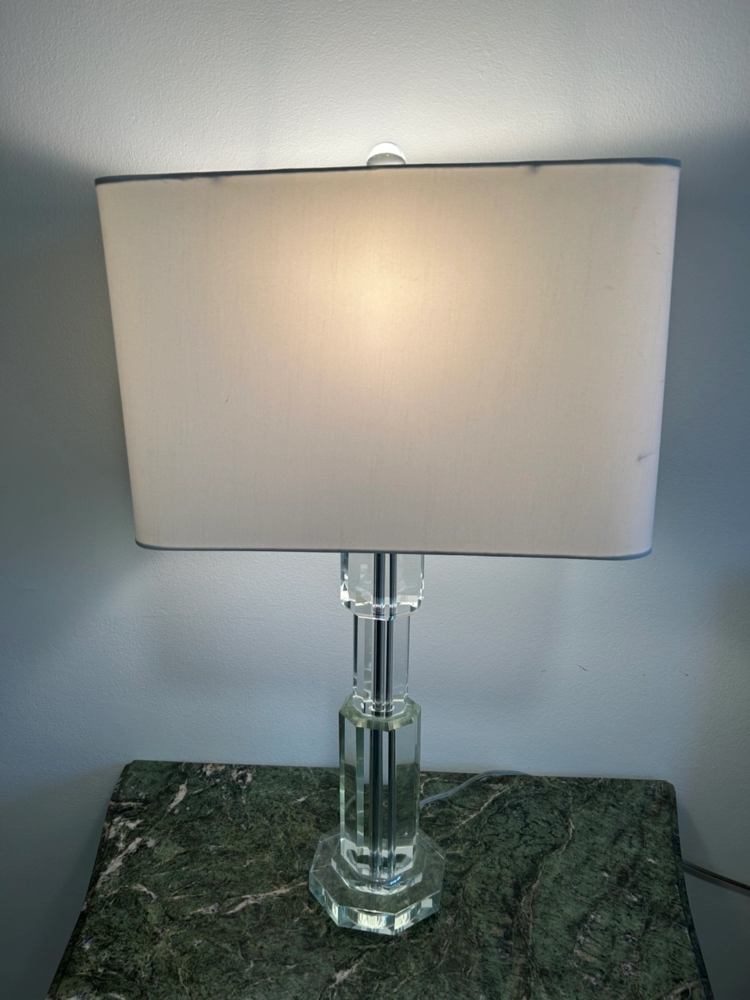 A stylish table lamp with a faceted crystal base. It comes with a rectangular white lampshade. Perfect for adding a touch of elegance to any room!