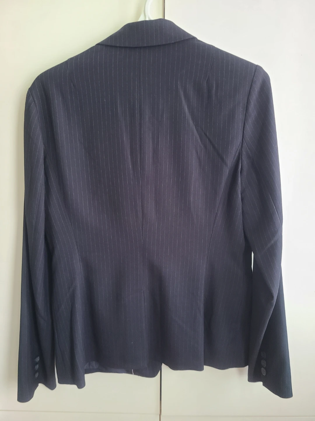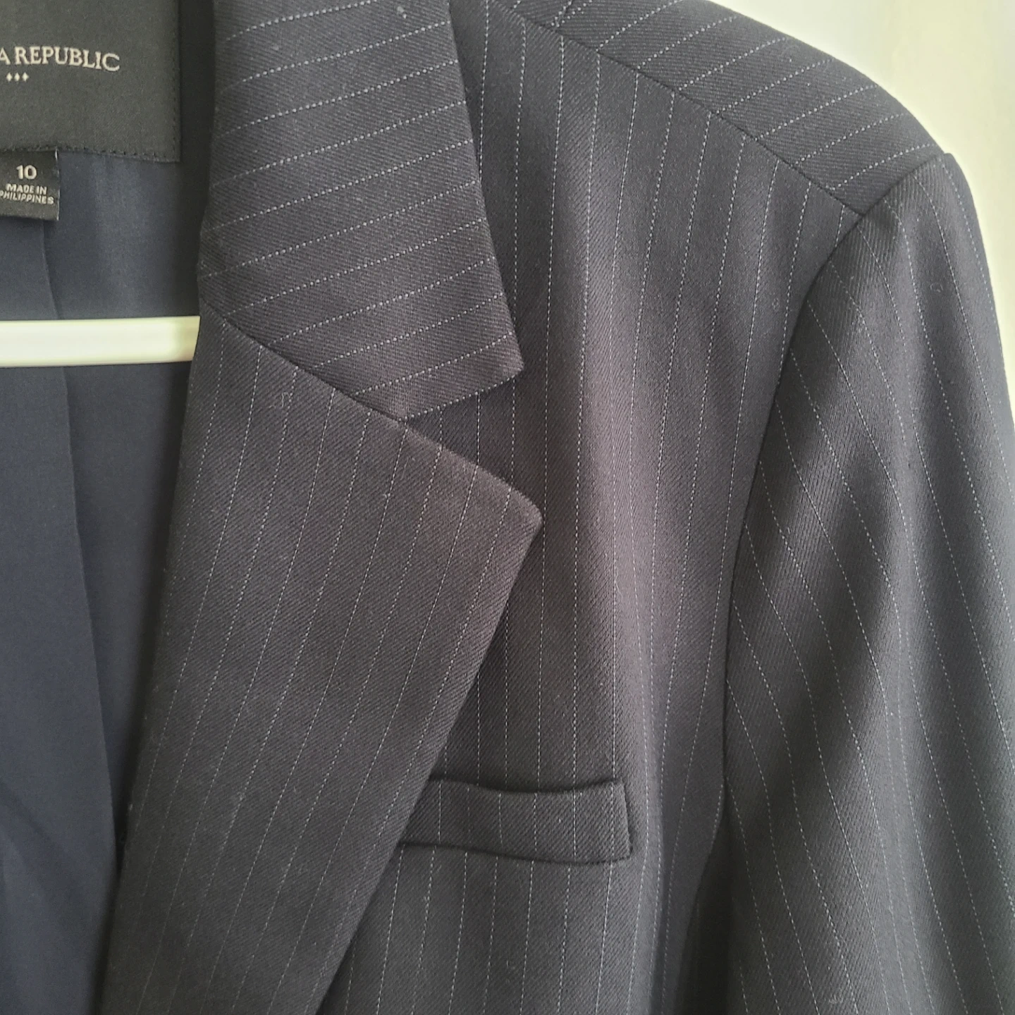 This is a Banana Republic pinstripe blazer in a women's size 10. It's a classic navy colour with subtle white pinstripes. The blazer has a two-button closure and front pockets.