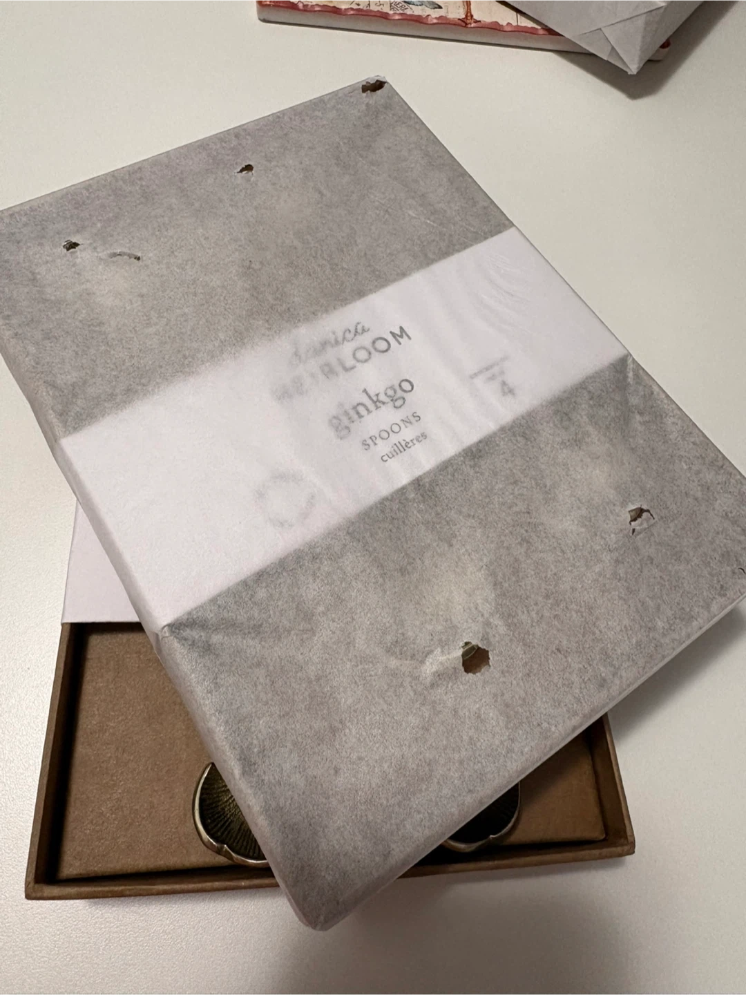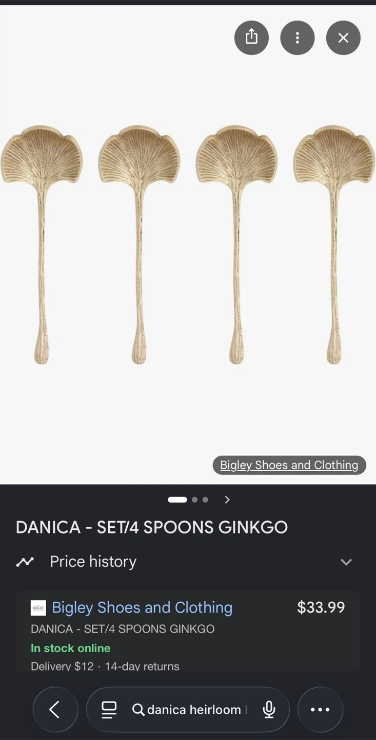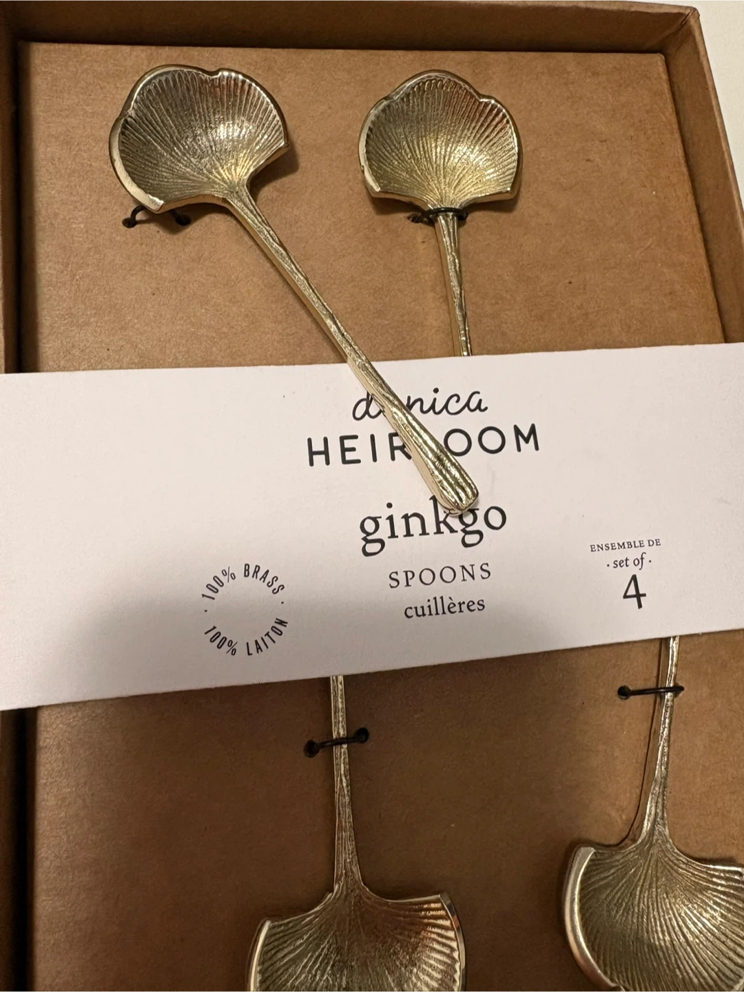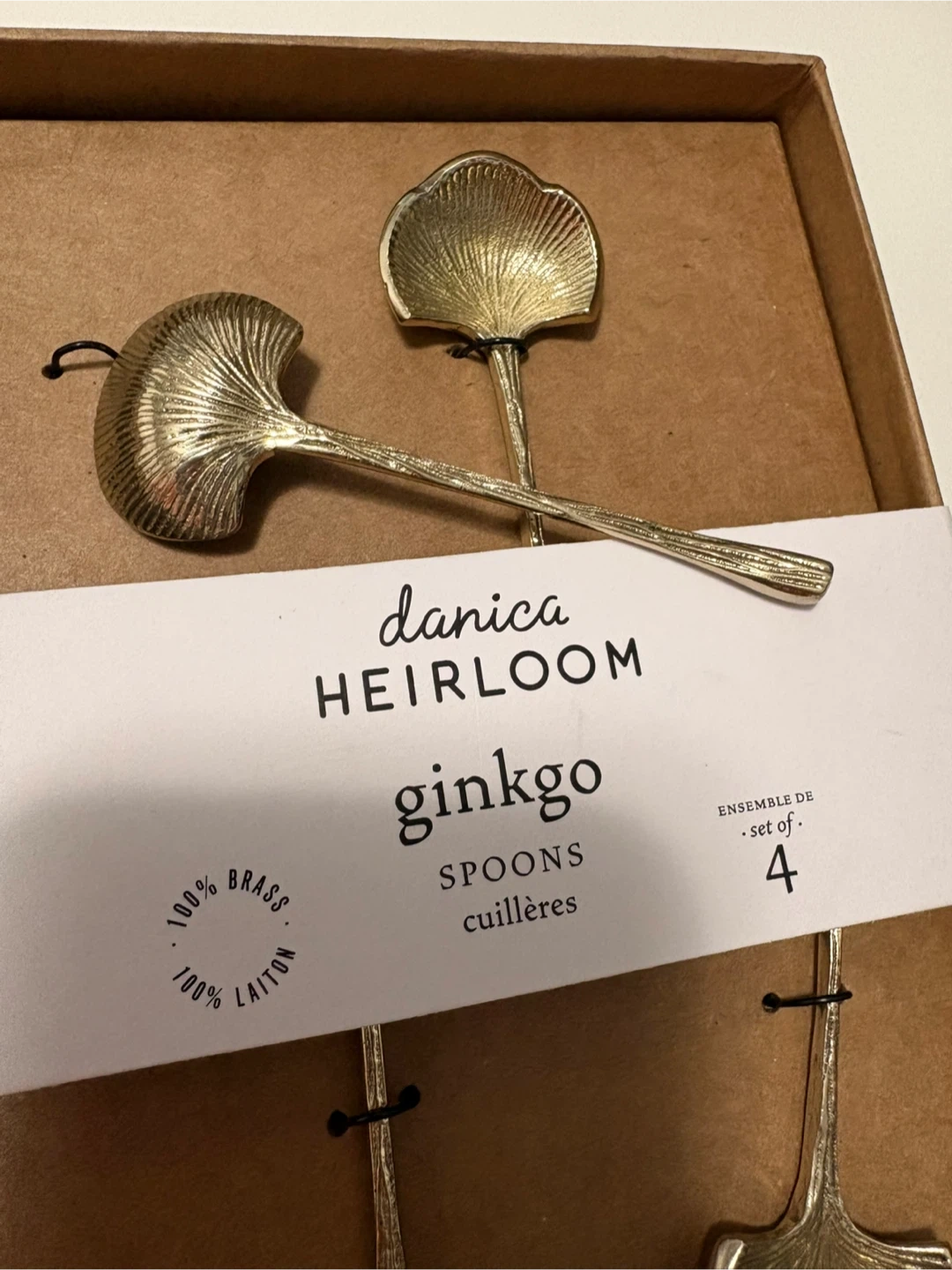 Brand new set of 4 Danica Heirloom Ginkgo spoons. Made from 100% brass. These spoons are dishwasher safe.