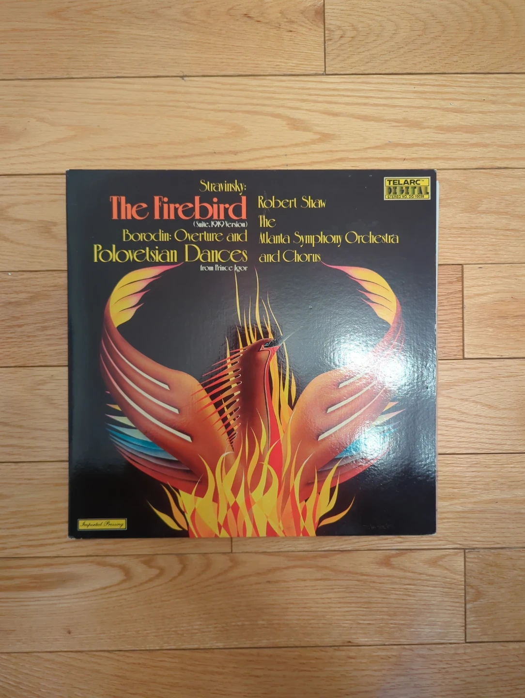 This is a vinyl record featuring Igor Stravinsky's 'The Firebird' and Borodin's 'Overture and Polovtsian Dances from Prince Igor'. The Atlanta Symphony Orchestra and Chorus, conducted by Robert Shaw, perform on this recording. It's a Telarc Digital recording. Includes original liner notes.