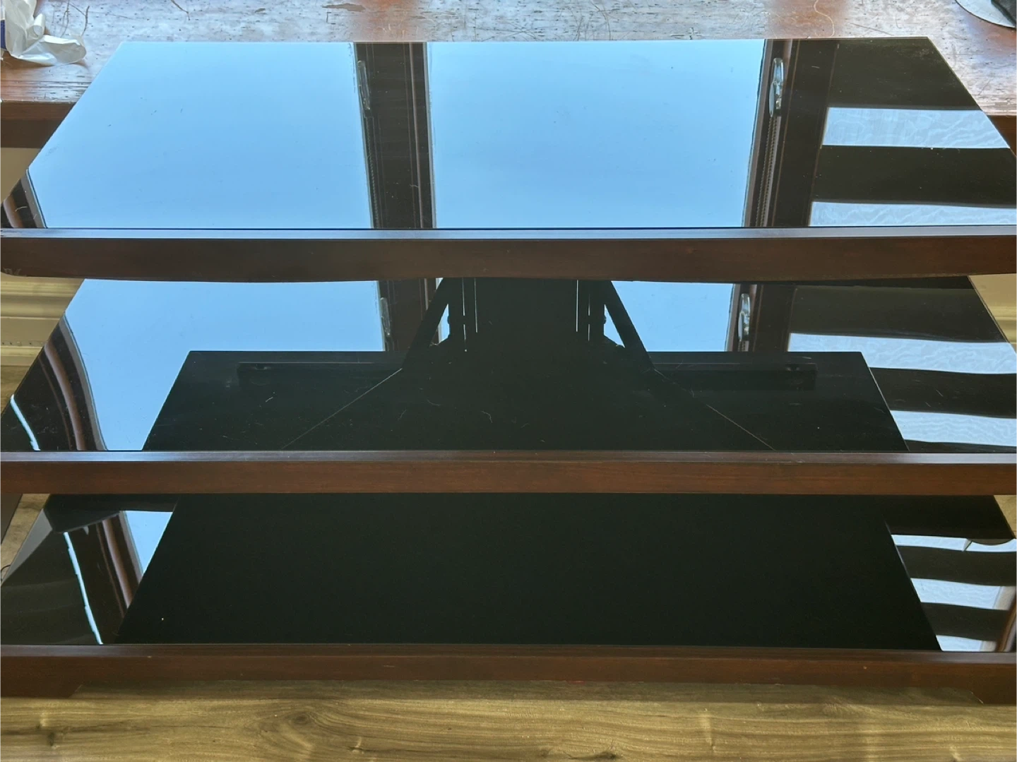 A 3-tier TV stand featuring a dark wood frame and sleek black glass shelves. It's designed to hold your media components and can accommodate most televisions. This stand would be useful for organizing electronics in a living room or entertainment space. 🥕