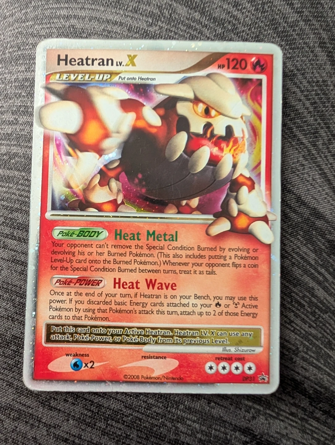 This Pokémon trading card features Heatran LV.X. It has a 'Heat Metal' Poke-Body and 'Heat Wave' Poke-Power. The card is from the 2008 Pokémon/Nintendo set.