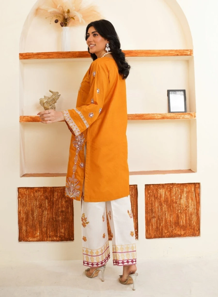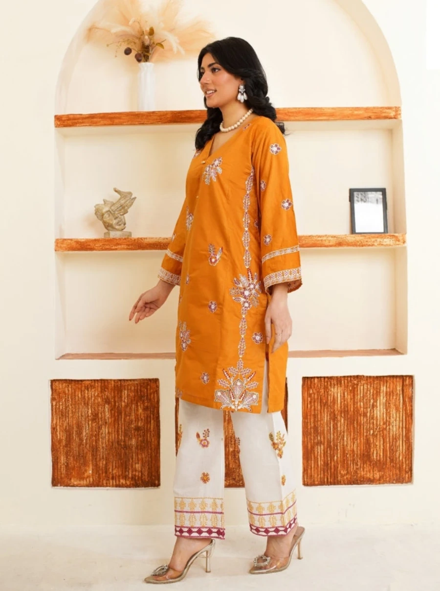 This is a lovely two-piece outfit featuring an orange kurti with intricate embroidery and matching white pants. The kurti has a a gorgeous embroidery while the pants are adorned with a complementary embroidered hem. It's a stylish choice for casual or festive occasions.