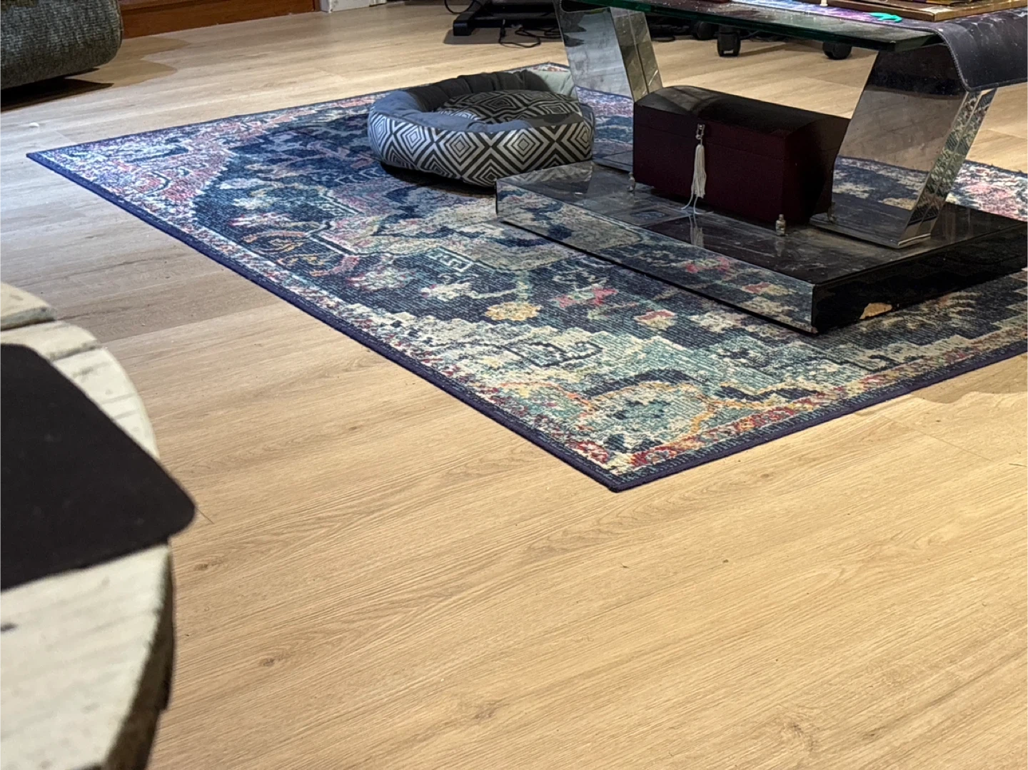 Persian-style area rug with a distressed dark blue, red, and teal pattern. It's a nice size for a living room or entryway. Adds a touch of warmth to any space! Comes from a clean and pet friendly home.