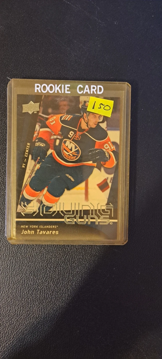 This is an Upper Deck Young Guns rookie card featuring John Tavares. The card is for the New York Islanders and shows him as a center. It's in a protective case.
