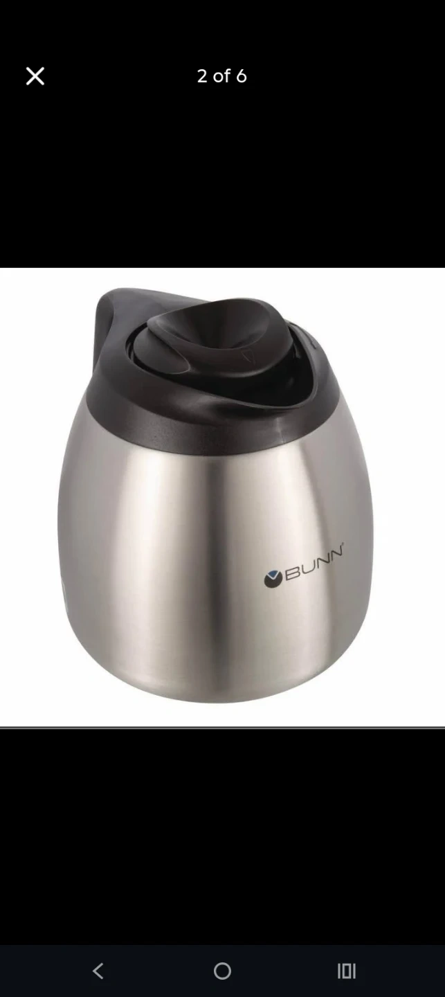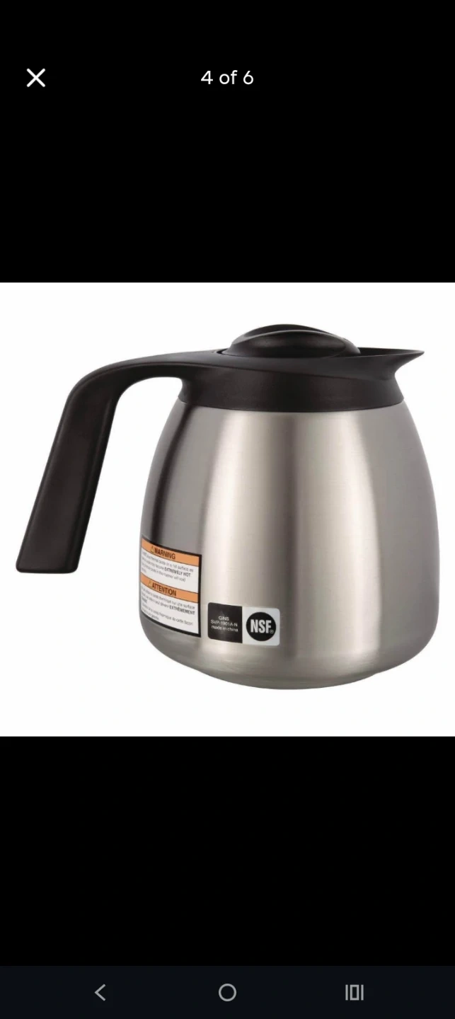 This Bunn coffee carafe is made of stainless steel with a black lid and handle. It's designed to keep your coffee warm. The NSF certification indicates it meets public health and safety standards.