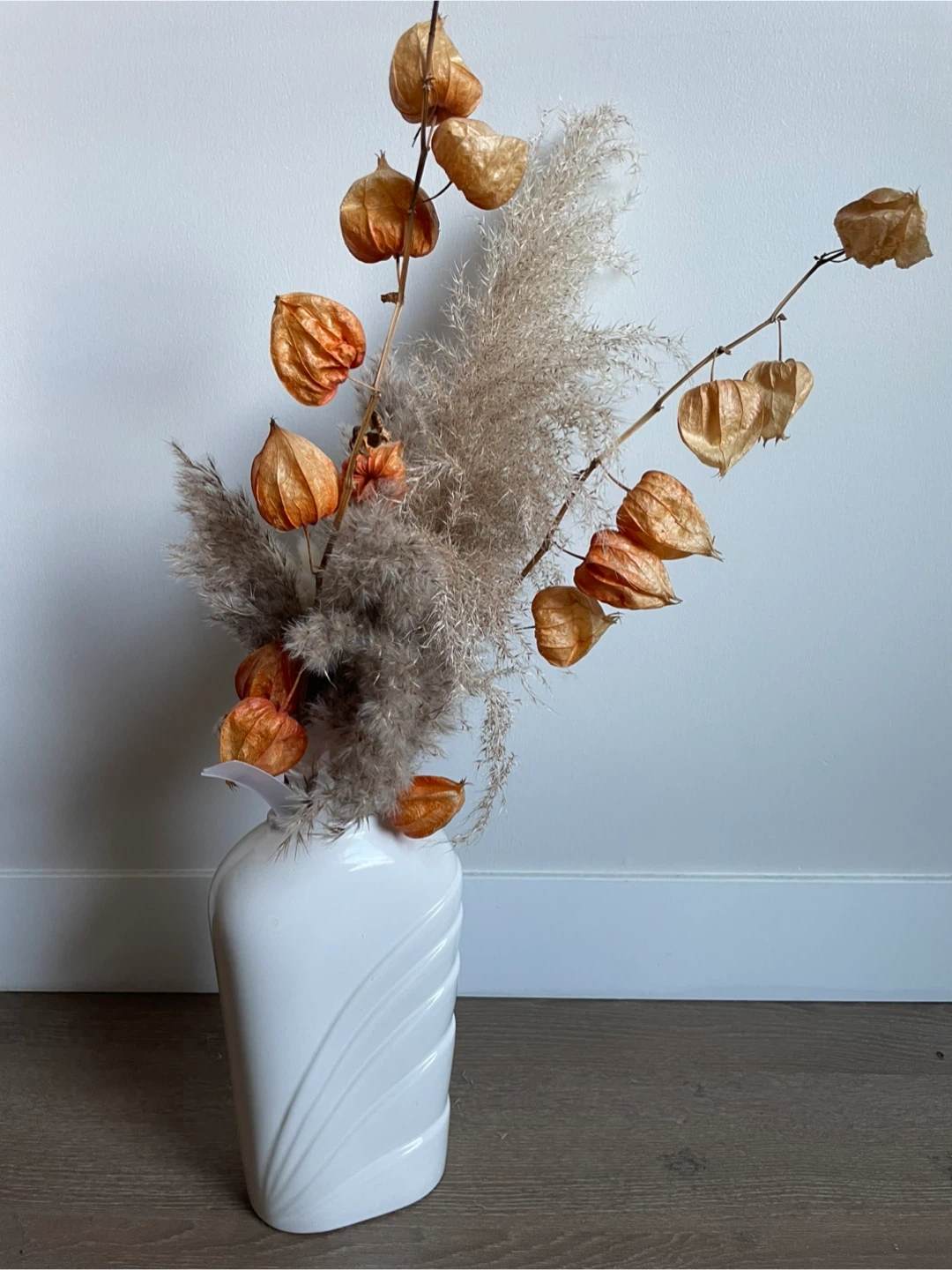 This arrangement features dried Chinese lanterns and pampas grass in a stylish white vase. The vase has a unique ribbed design. It's a beautiful decorative piece for any room.