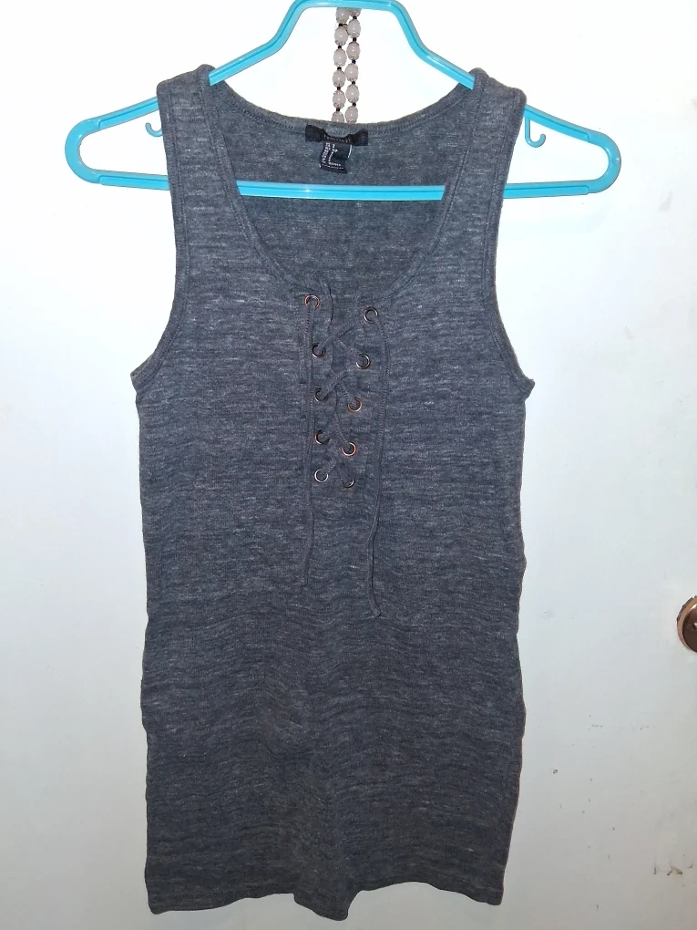 A grey tank top from Forever 21, size small! It's in great condition and features a unique lace-up design at the front. Perfect for a casual day out or layering under a jacket.