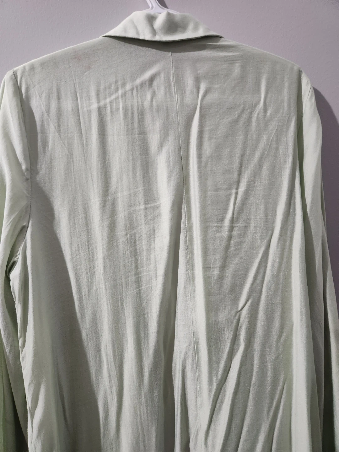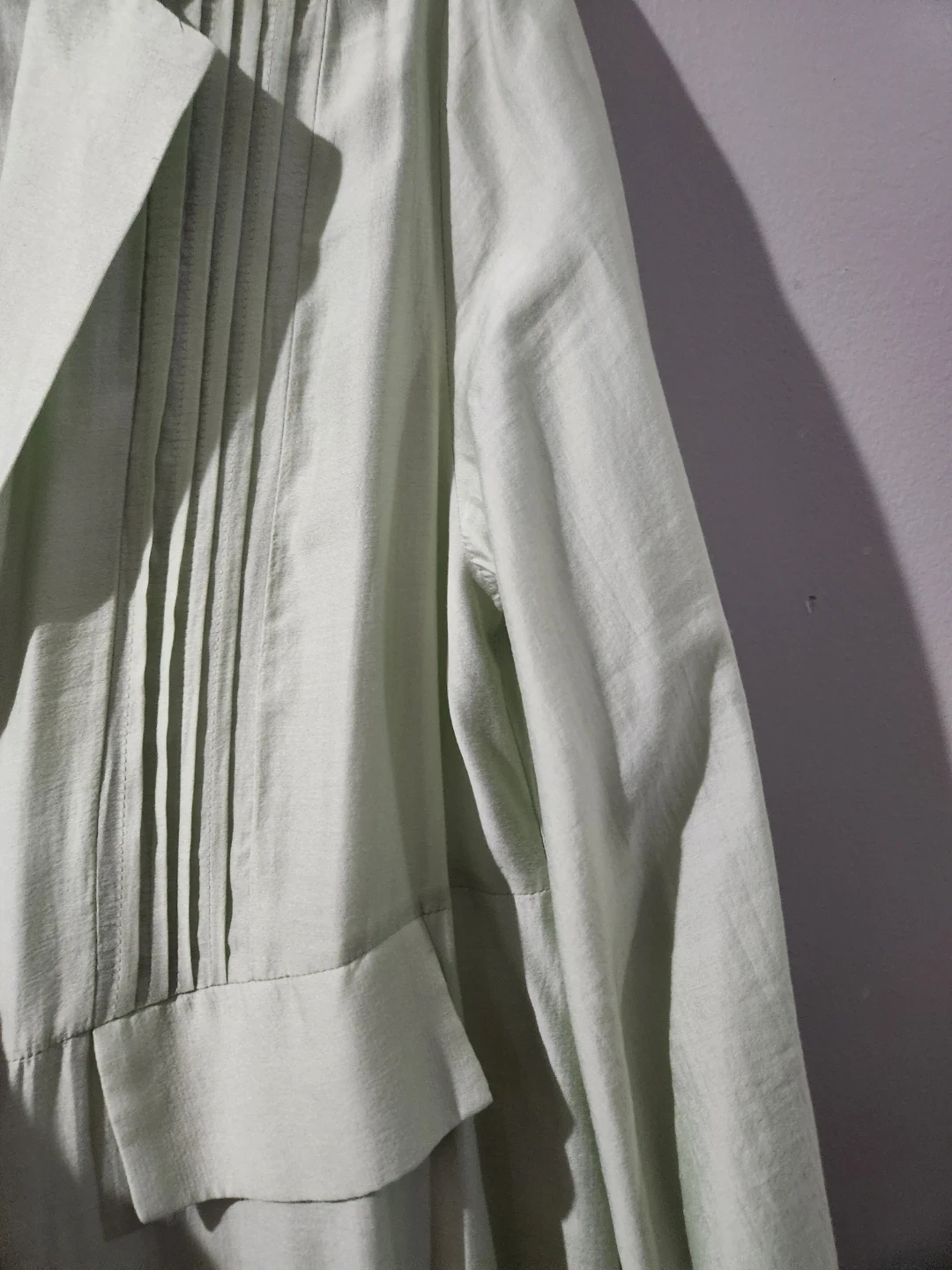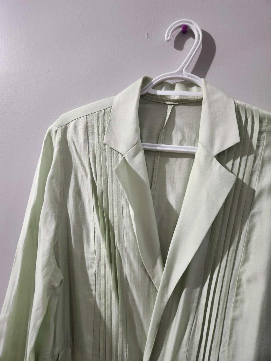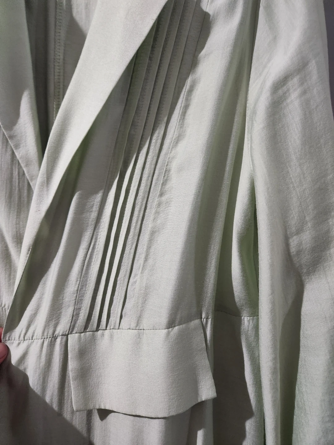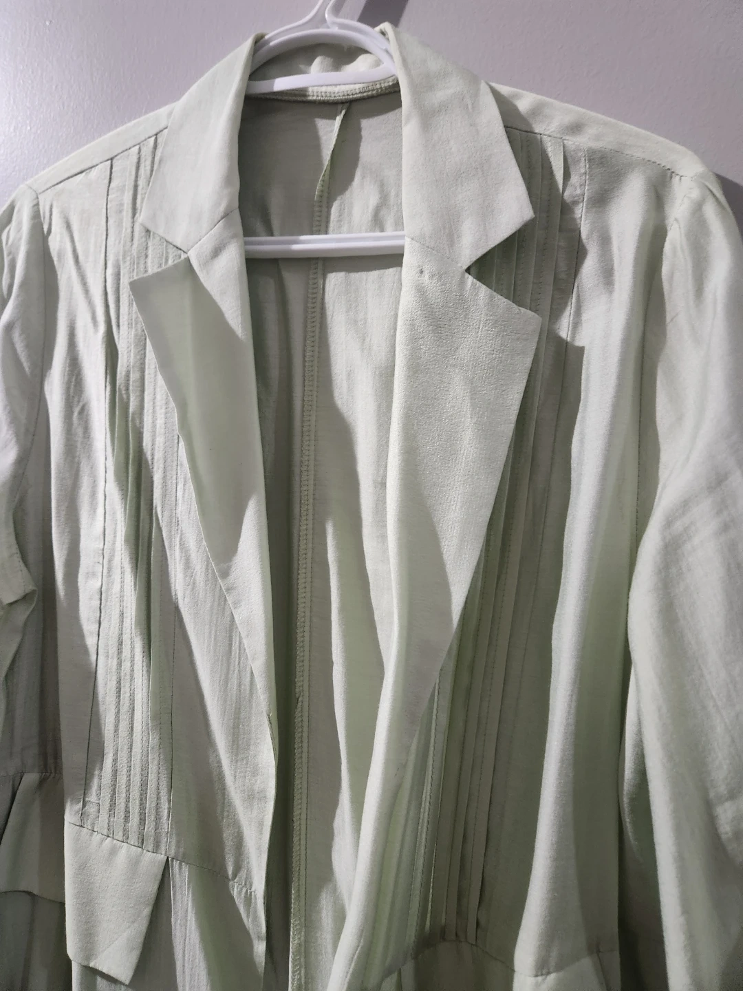 A light green duster jacket with pleated detailing on the front. It has a classic lapel and pockets. This jacket is made of a lightweight fabric, perfect for layering. size large, chest 22 inches, long 52 inches
