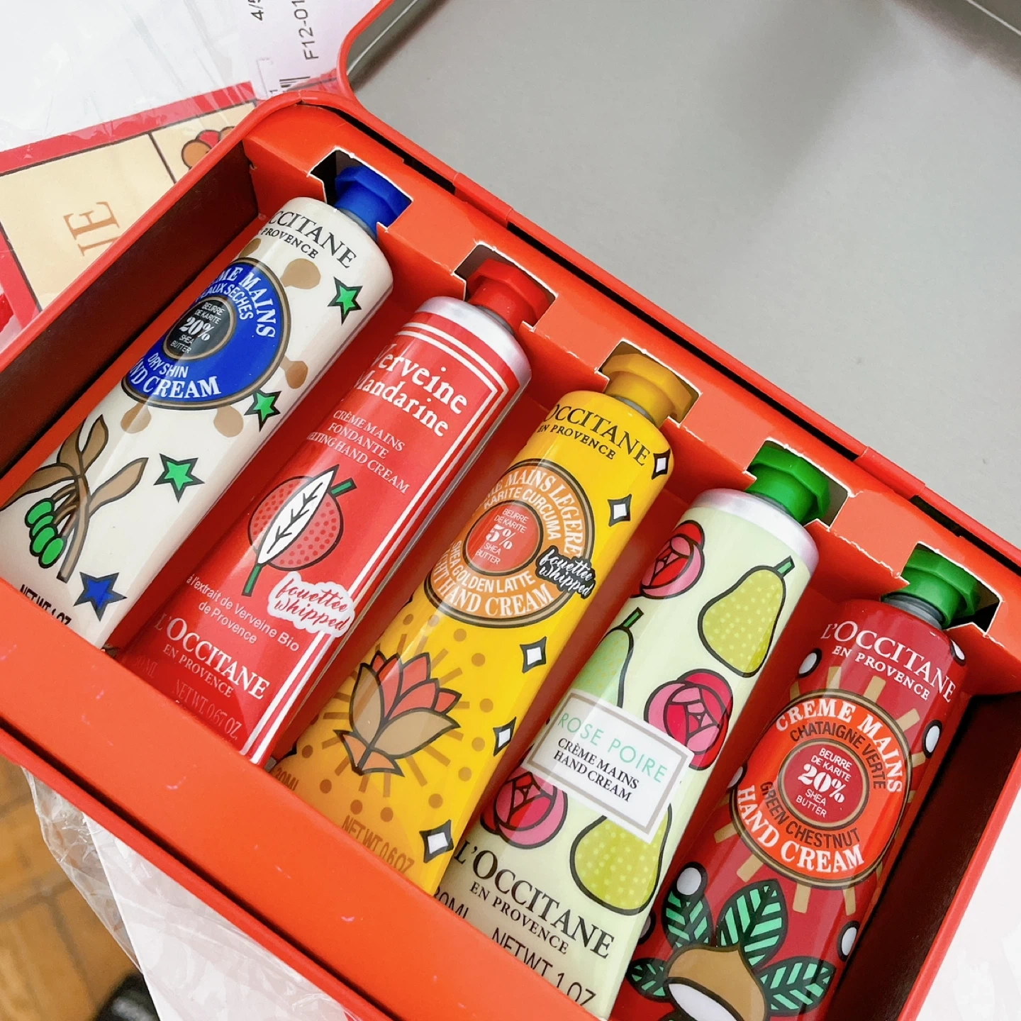This L'Occitane hand cream set includes five different scents. Scents are Dry Skin, Verbena Mandarin, Shea Golden Latte, Rose Pear, and Green Chestnut. Net weights range from 0.6 oz to 1.07 oz per cream. These creams contain shea butter.