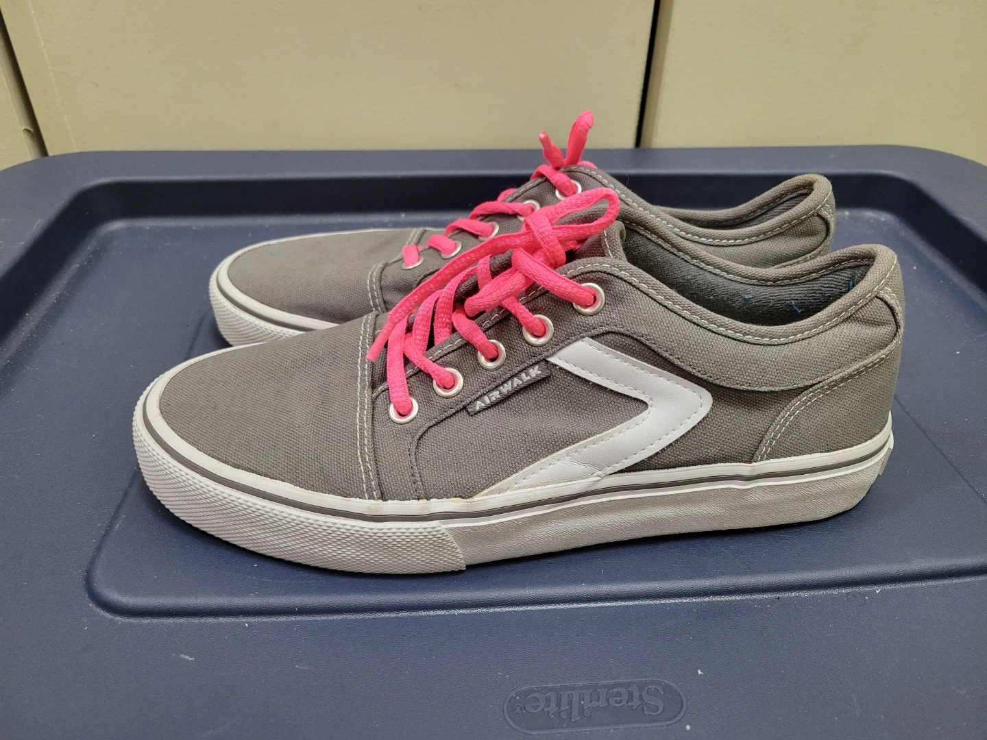 Selling a pair of Airwalk gently used almost like new canvas sneakers. Wore one time. They are gray with white accents and have bright pink laces. Will include extra color laces and original laces. These sneakers are in good condition and ready for a new owner!