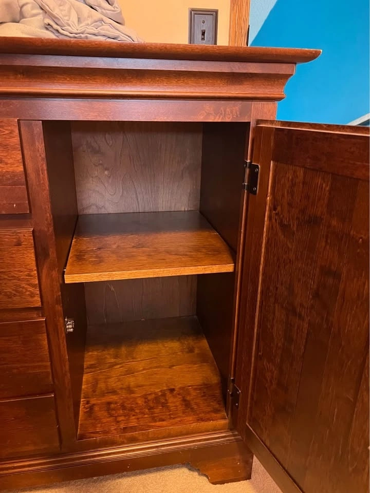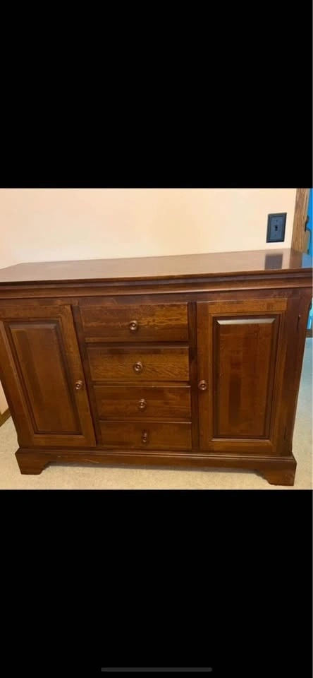 This dresser is in good condition. The dresser looks oranger than it is in the picture. Was bought for a changing table and dresser. It is 52 inch’s long, 19 3/4 inches deep, 37 inches high.