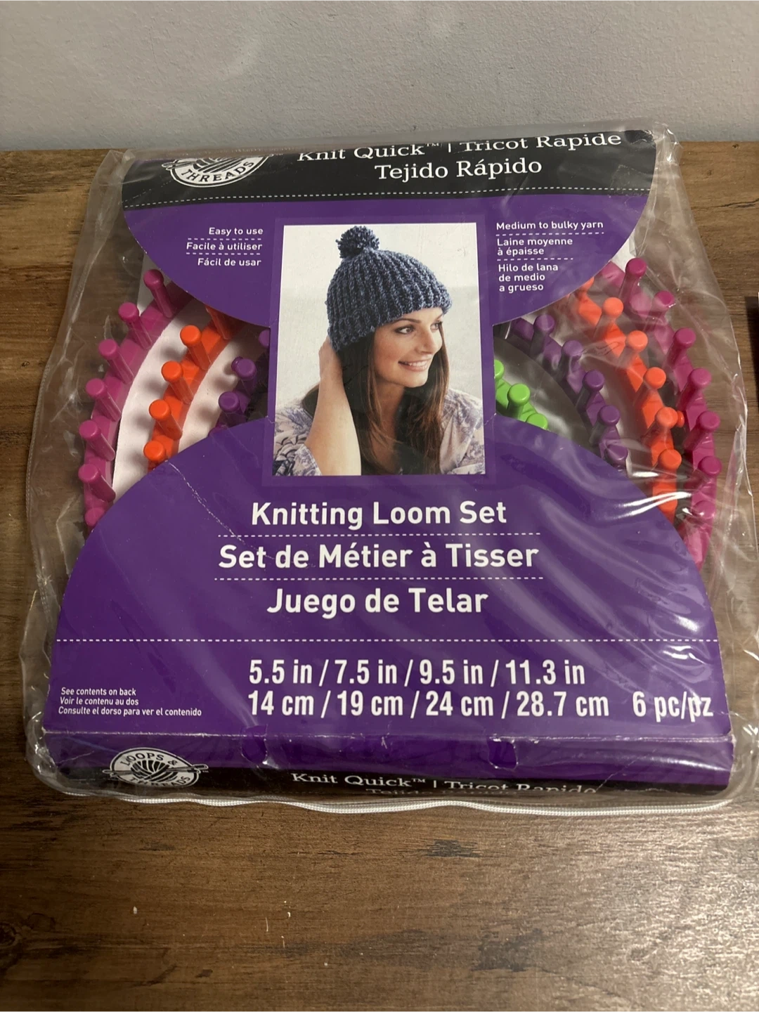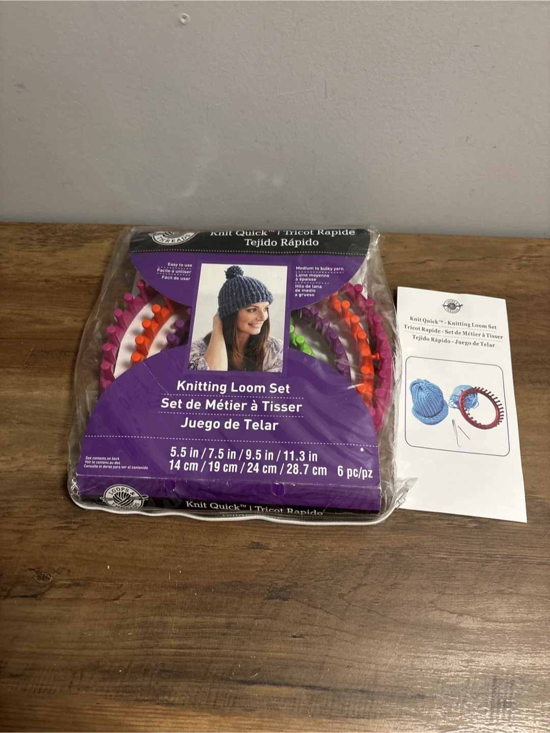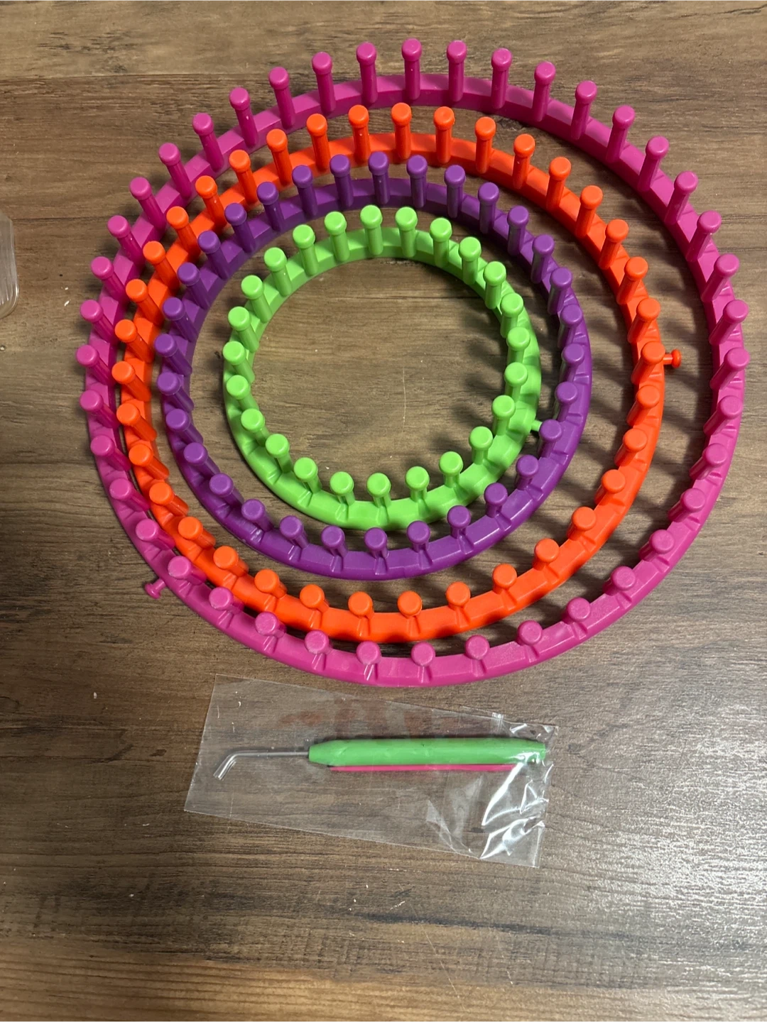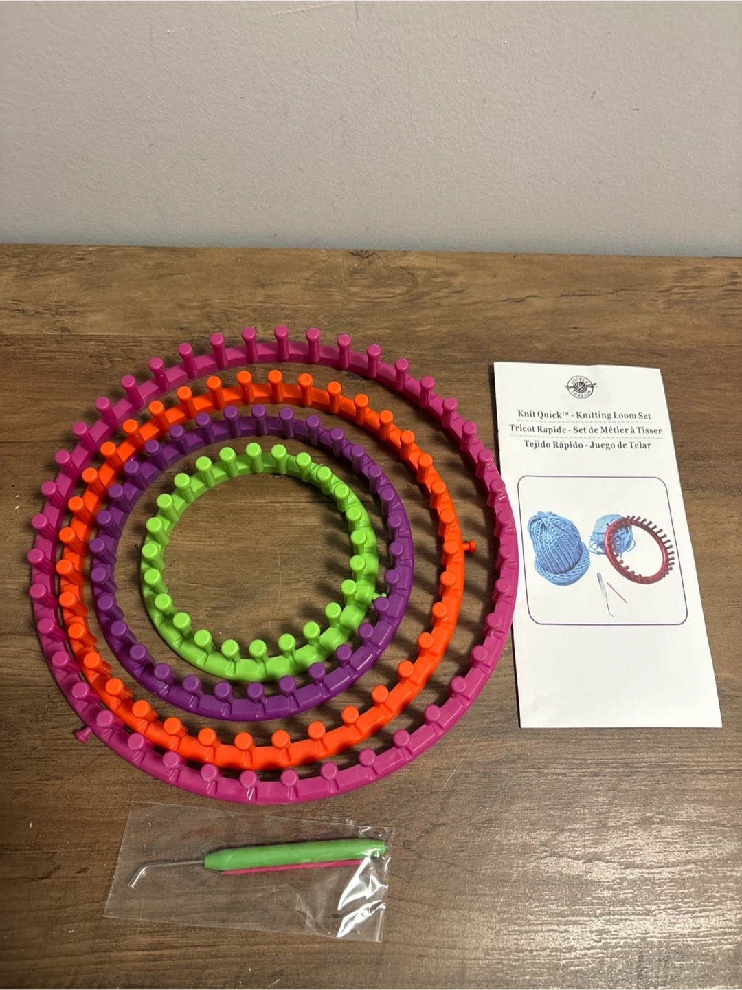 This is the Loops & Threads Knit Quick Knitting Loom Set. It includes 4 looms in various sizes: 5.5 in, 7.5 in, 9.5 in, and 11.3 in. Knitting hook is also included.