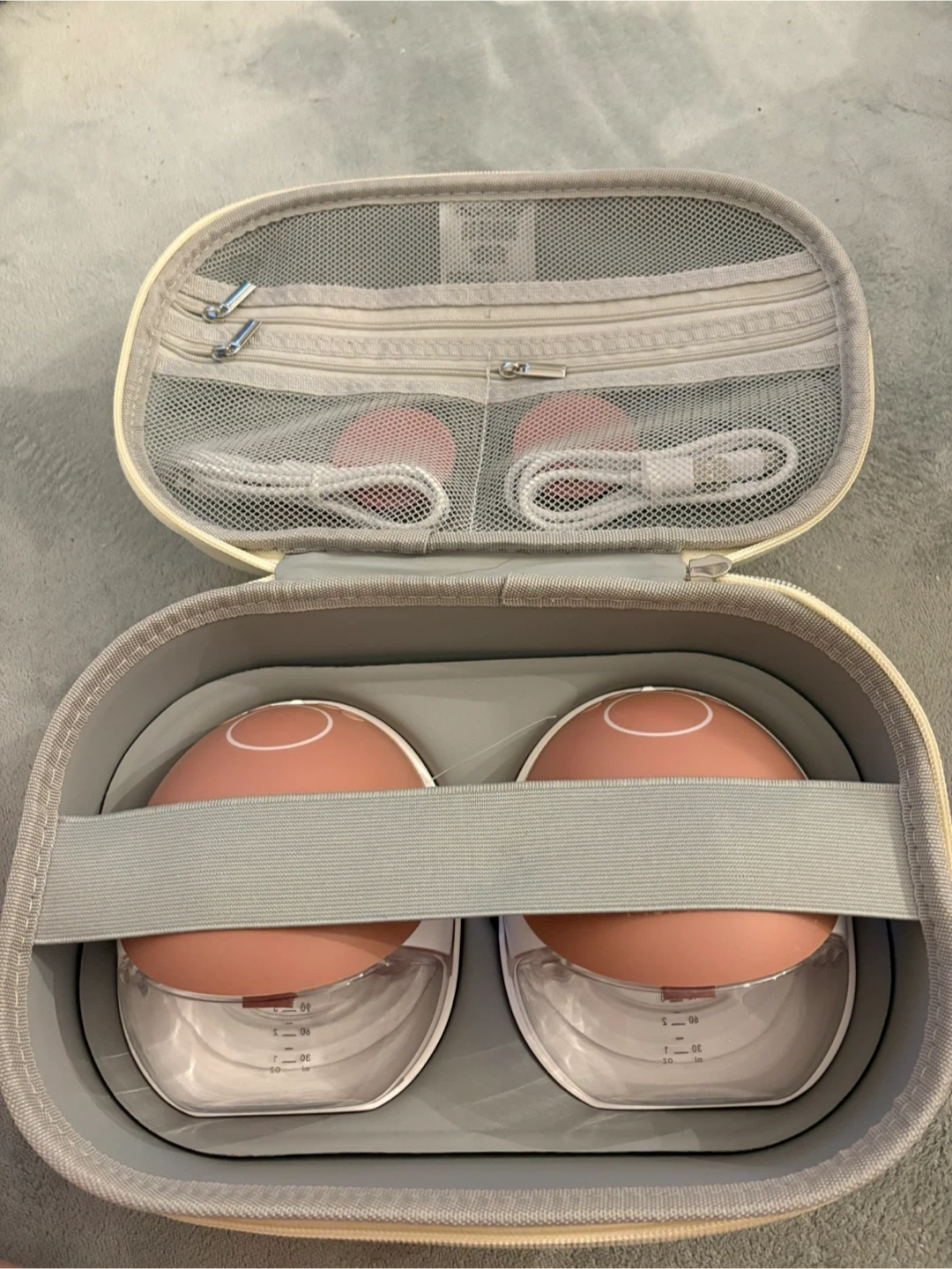This Momcozy wearable breast pump kit comes in a convenient carrying case. It includes two breast pumps and charging cables. They are designed for discreet use.