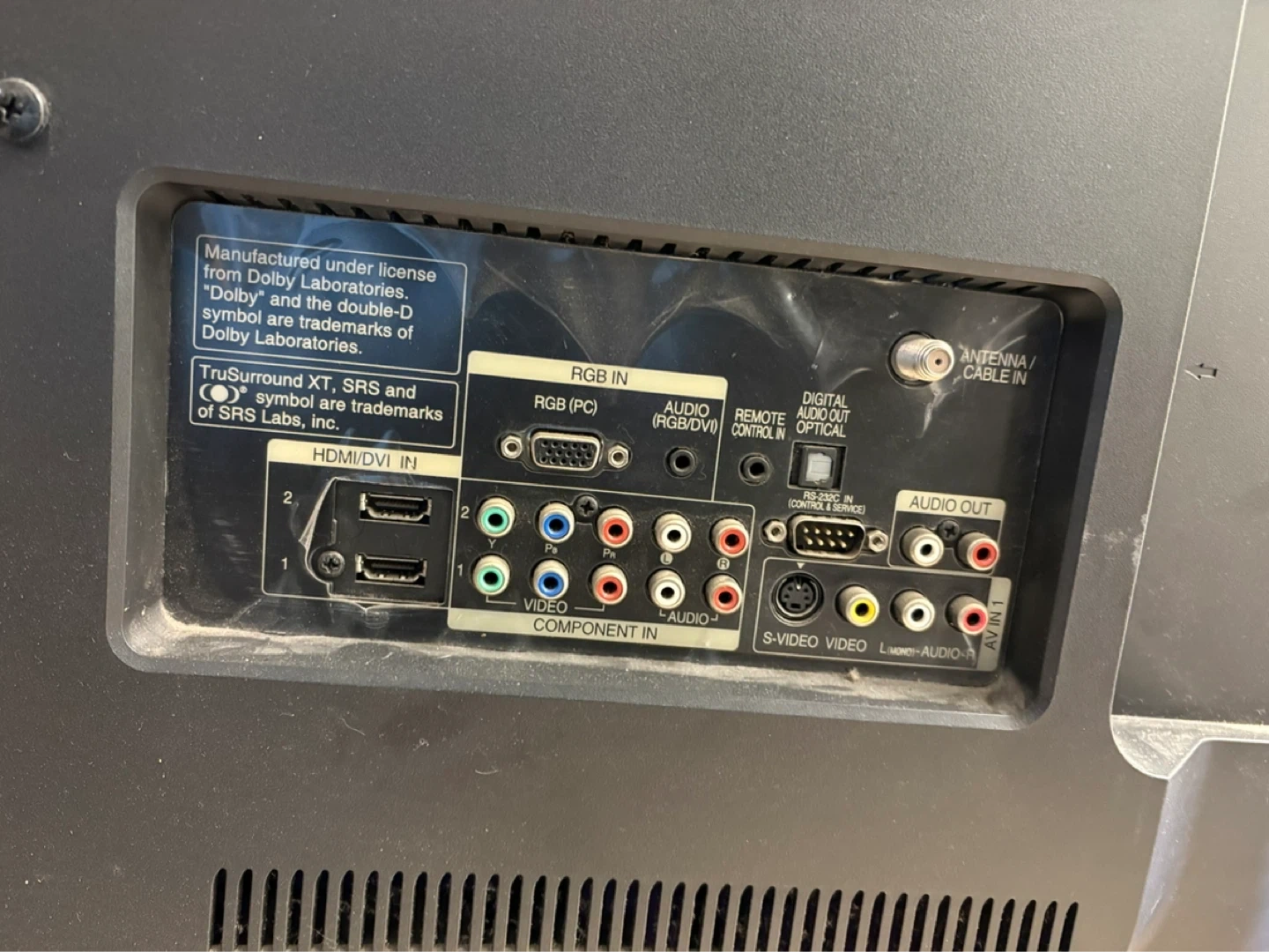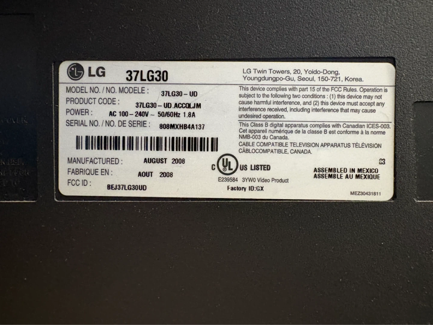 LG 37 inch LCD TV, model 37LG30. Manufactured August 2008. It features multiple HDMI and component inputs.