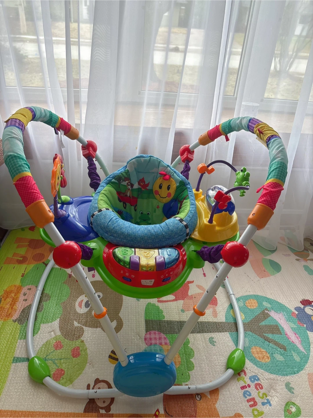 This Baby Einstein Neighborhood Friends Activity Jumper provides entertainment and exploration for your little one. It features multiple activity stations, including a light-up piano and spinning toys. The jumper is designed for babies to bounce and play safely for above 4 months old - they may not use it anymore after 1.5 year old but before that they’ll have lots of fun for your kids who love jumping.
