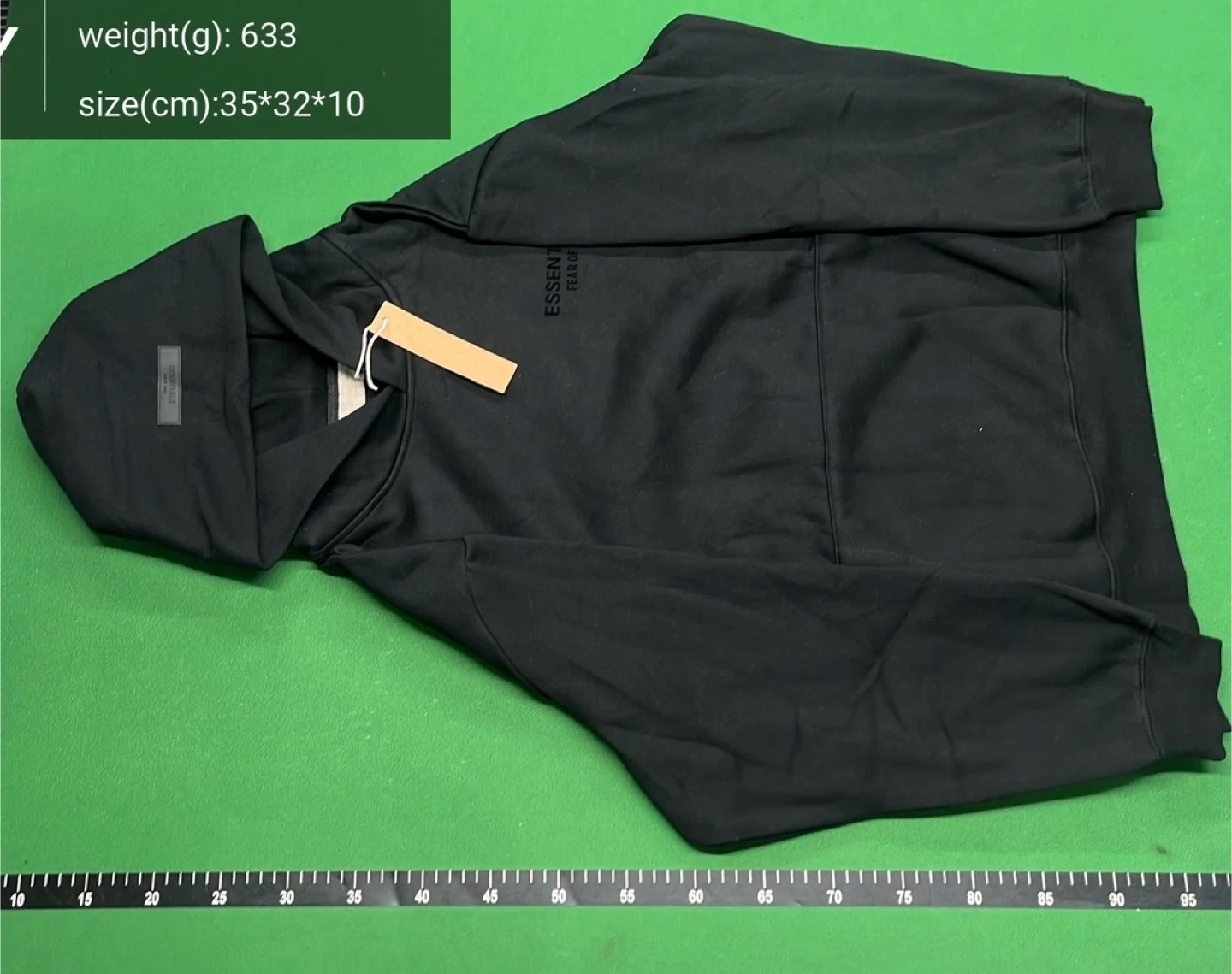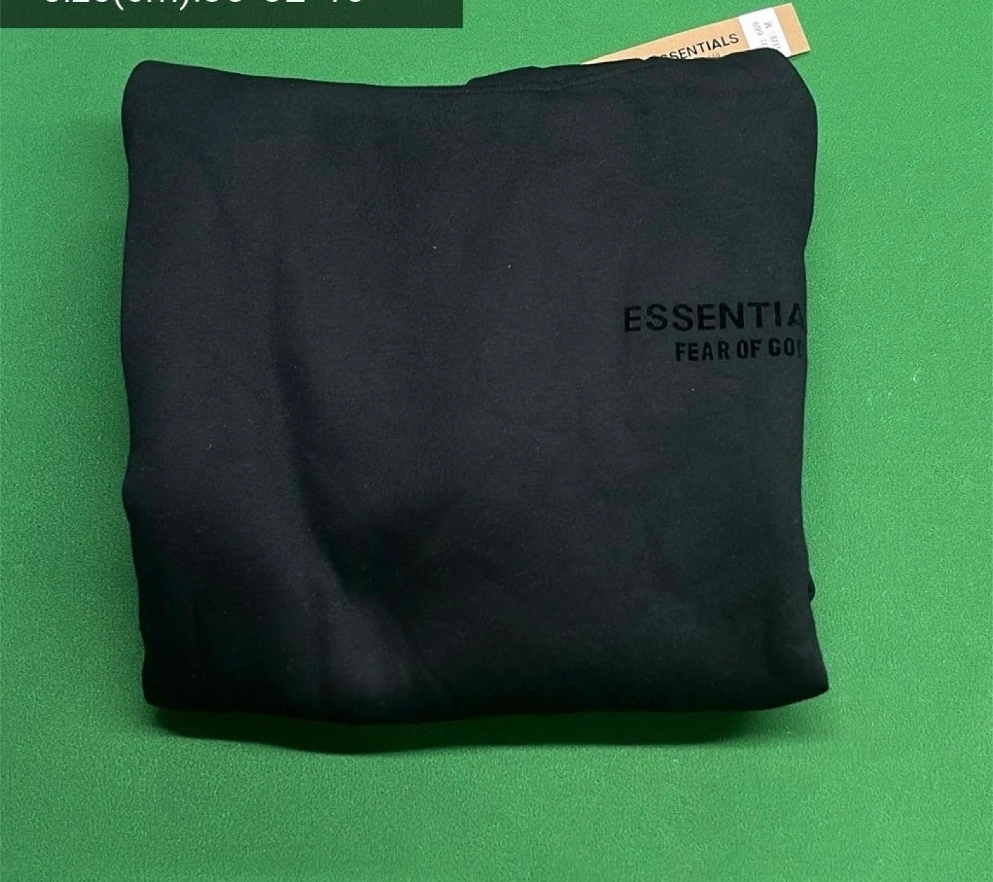 This is a black hoodie from Fear of God Essentials. It's made of a soft material. It's a pullover style with a front pocket. This hoodie is great for casual wear.