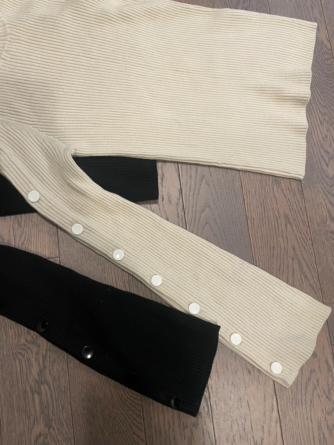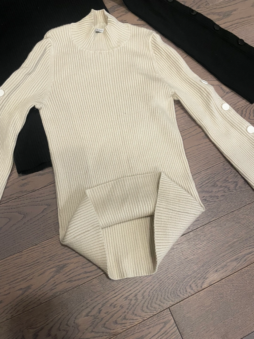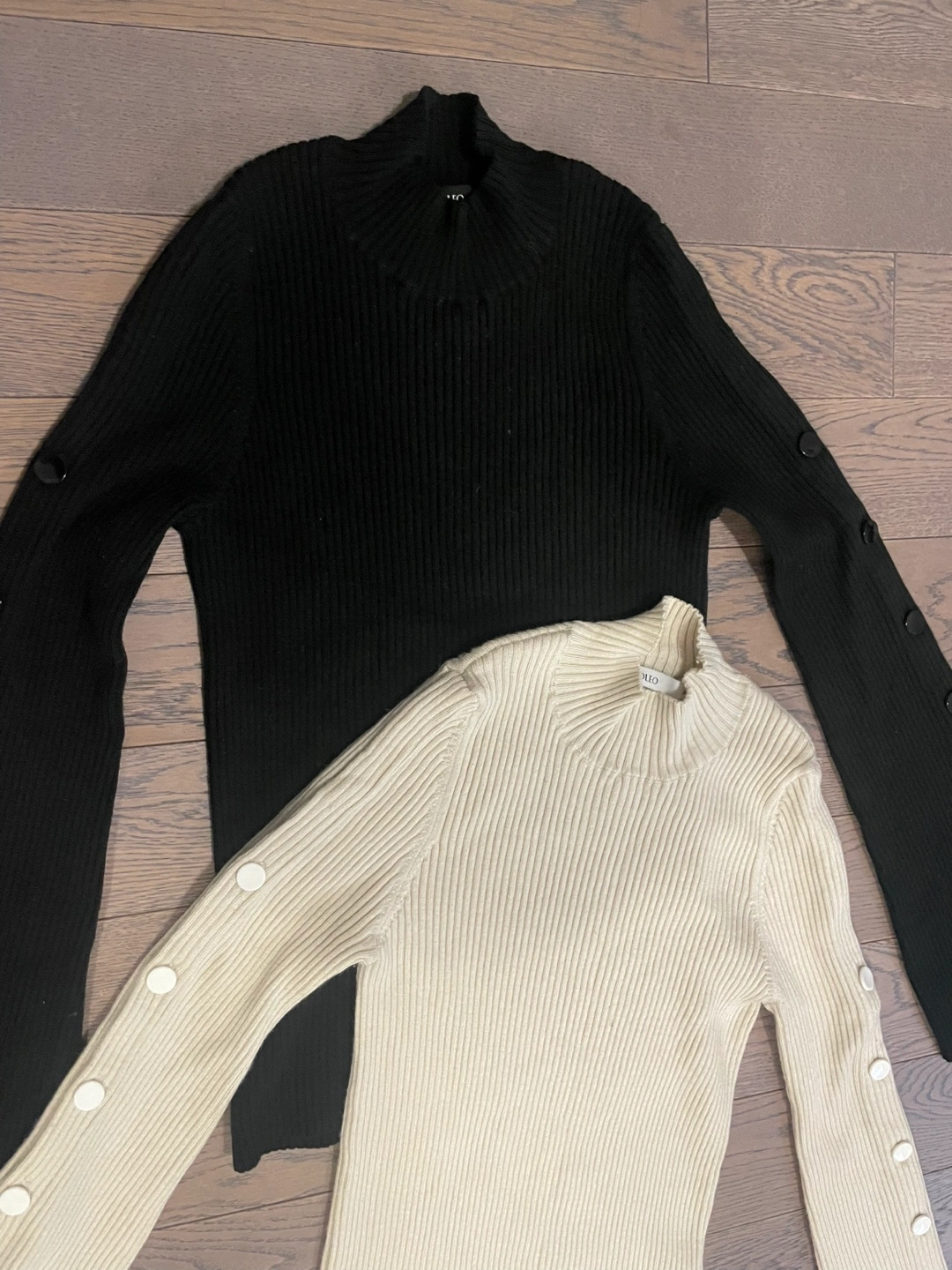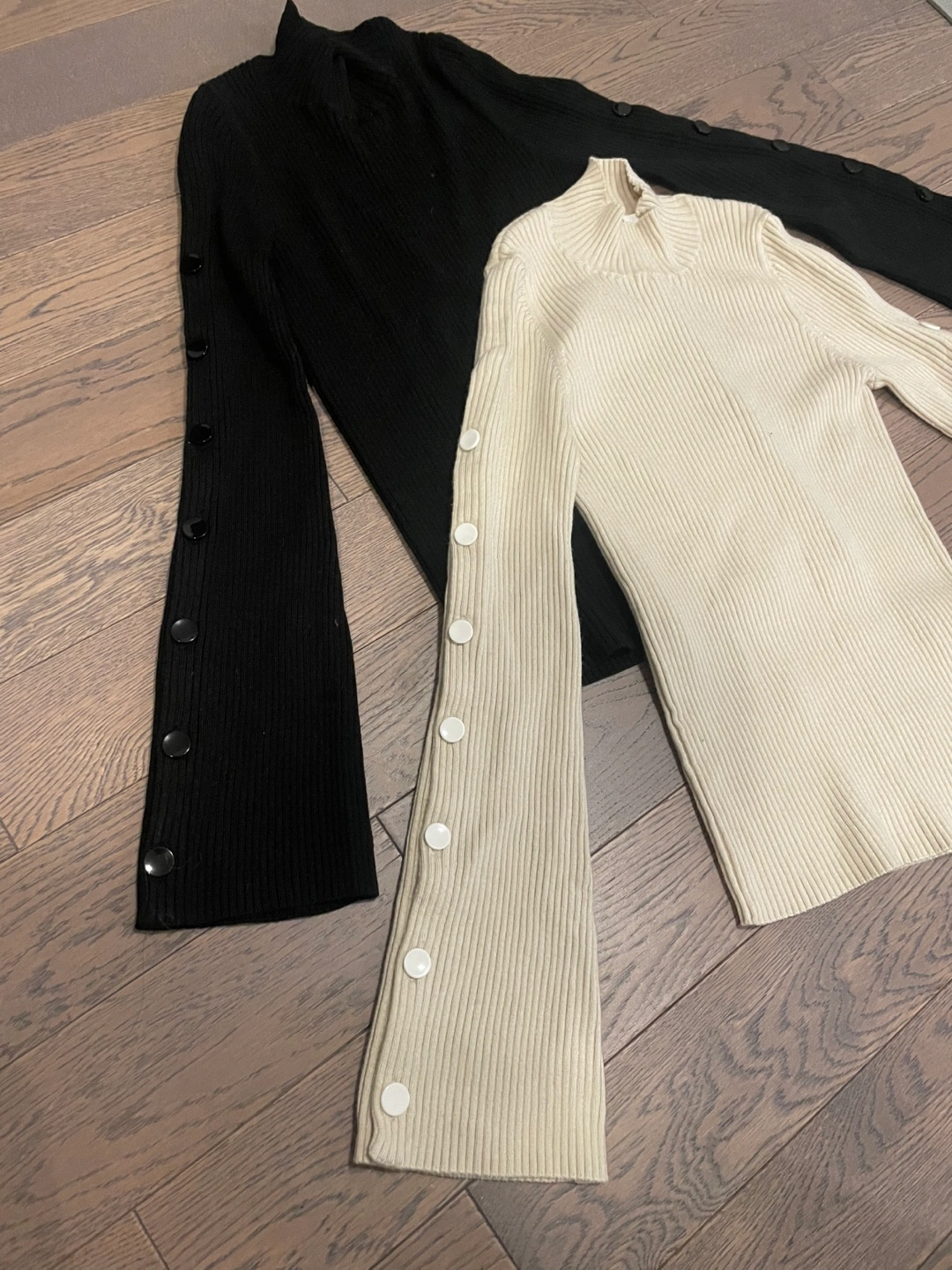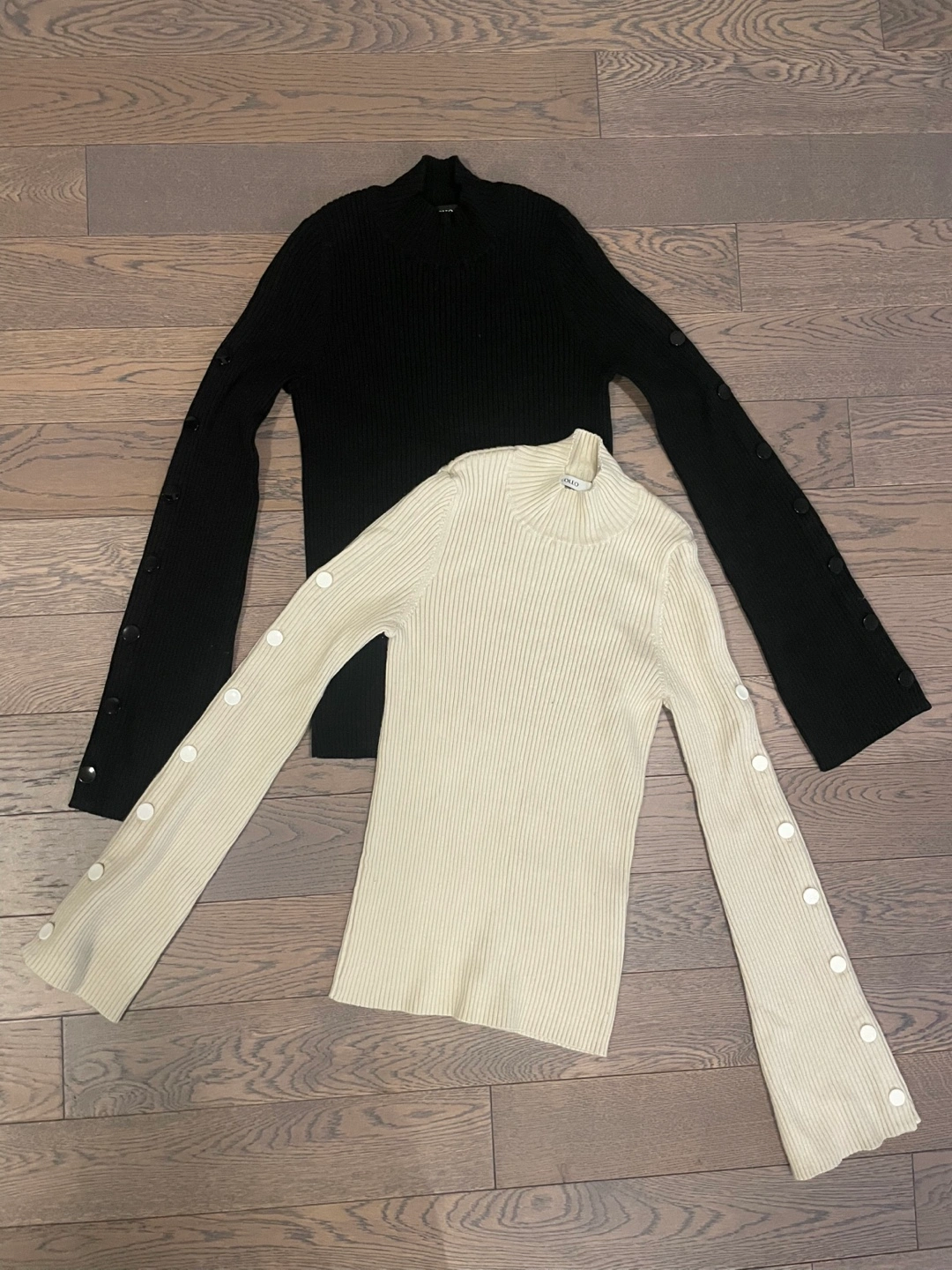 Two long-sleeved tops, one in black and one in cream. Both feature a mock neck and ribbed knit material. Sleeves have a flare design with button accents. Great for layering or wearing on their own!