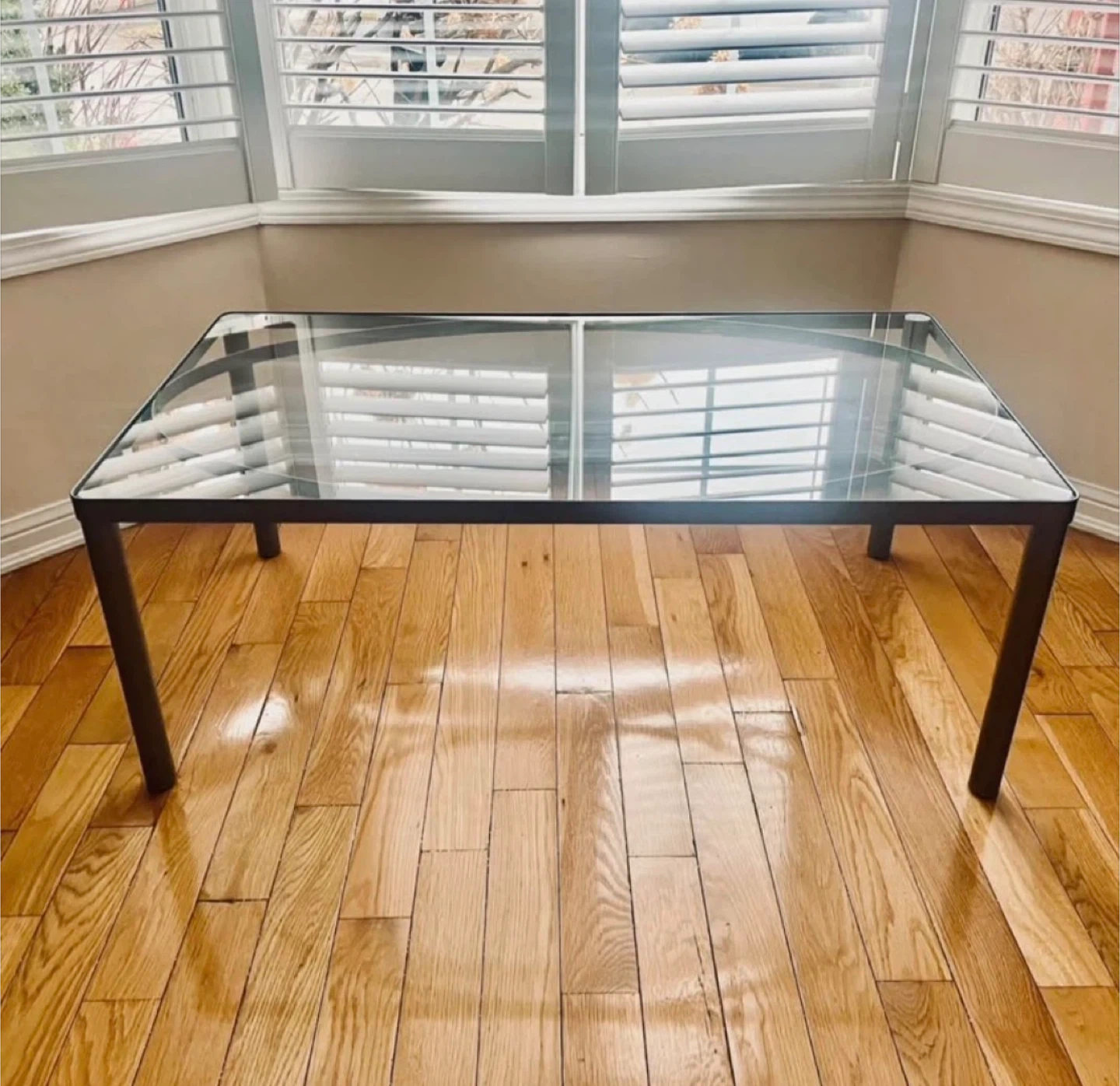 Stylish glass coffee table with a sleek metal frame. It's a modern addition to any living room. Perfect for holding drinks and decor.