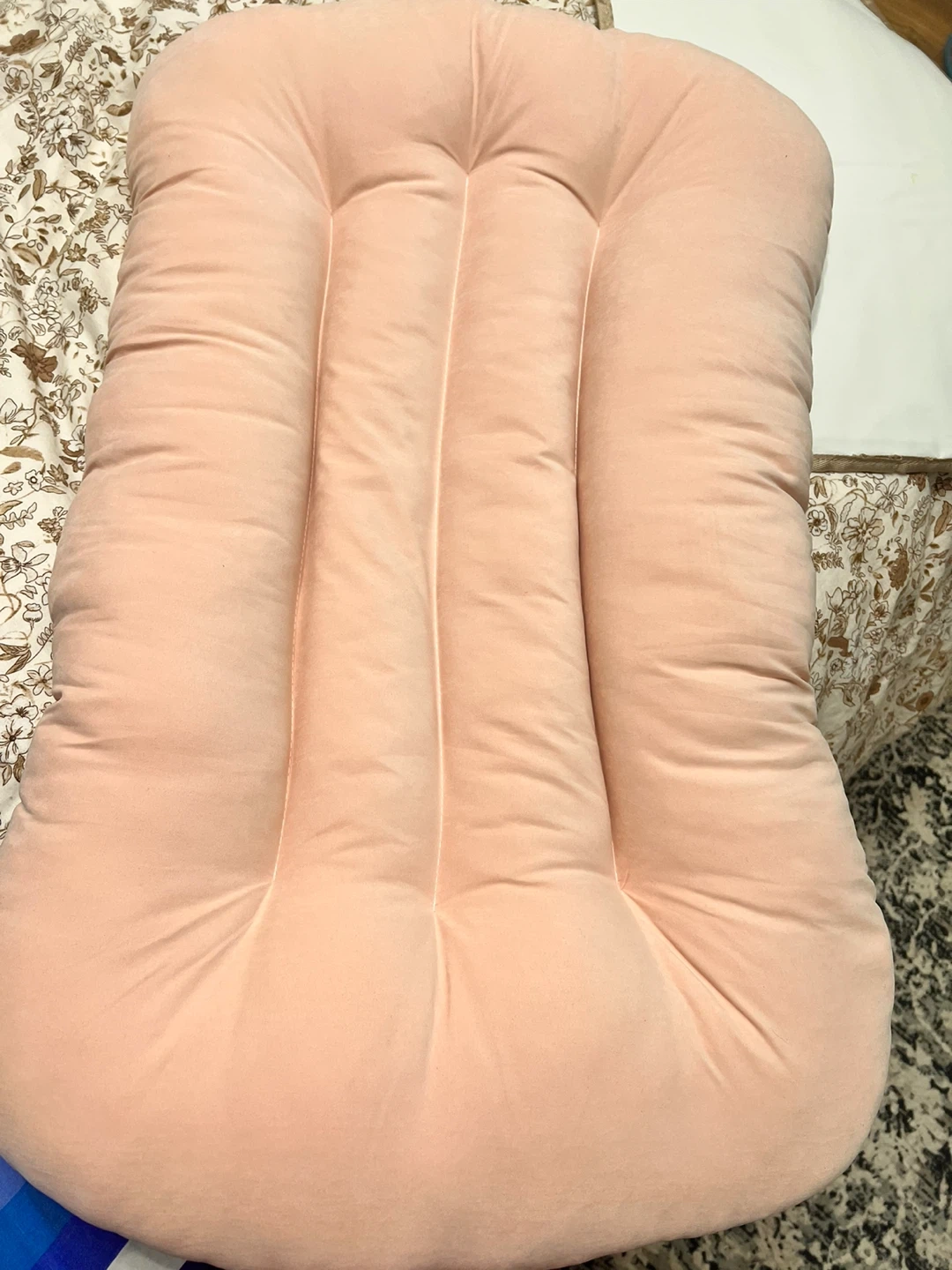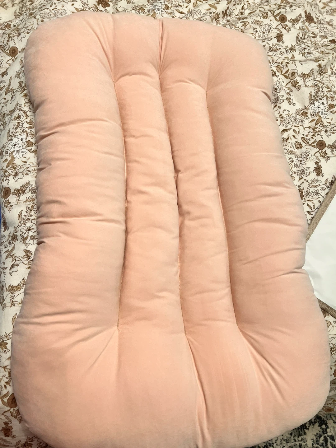 A soft, pink pillow lounger for babies. It offers a comfortable surface for little ones to rest on. The plush material is gentle on the baby's skin. Clean and used only 1 months with cover