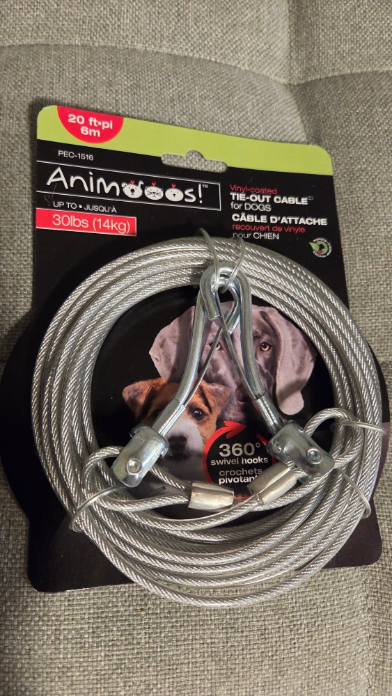I'm selling 2 brand new vinyl-coated tie-out cable for dogs. It's 20 ft long and suitable for dogs up to 30 lbs (14kg). It also features 360° swivel hooks.