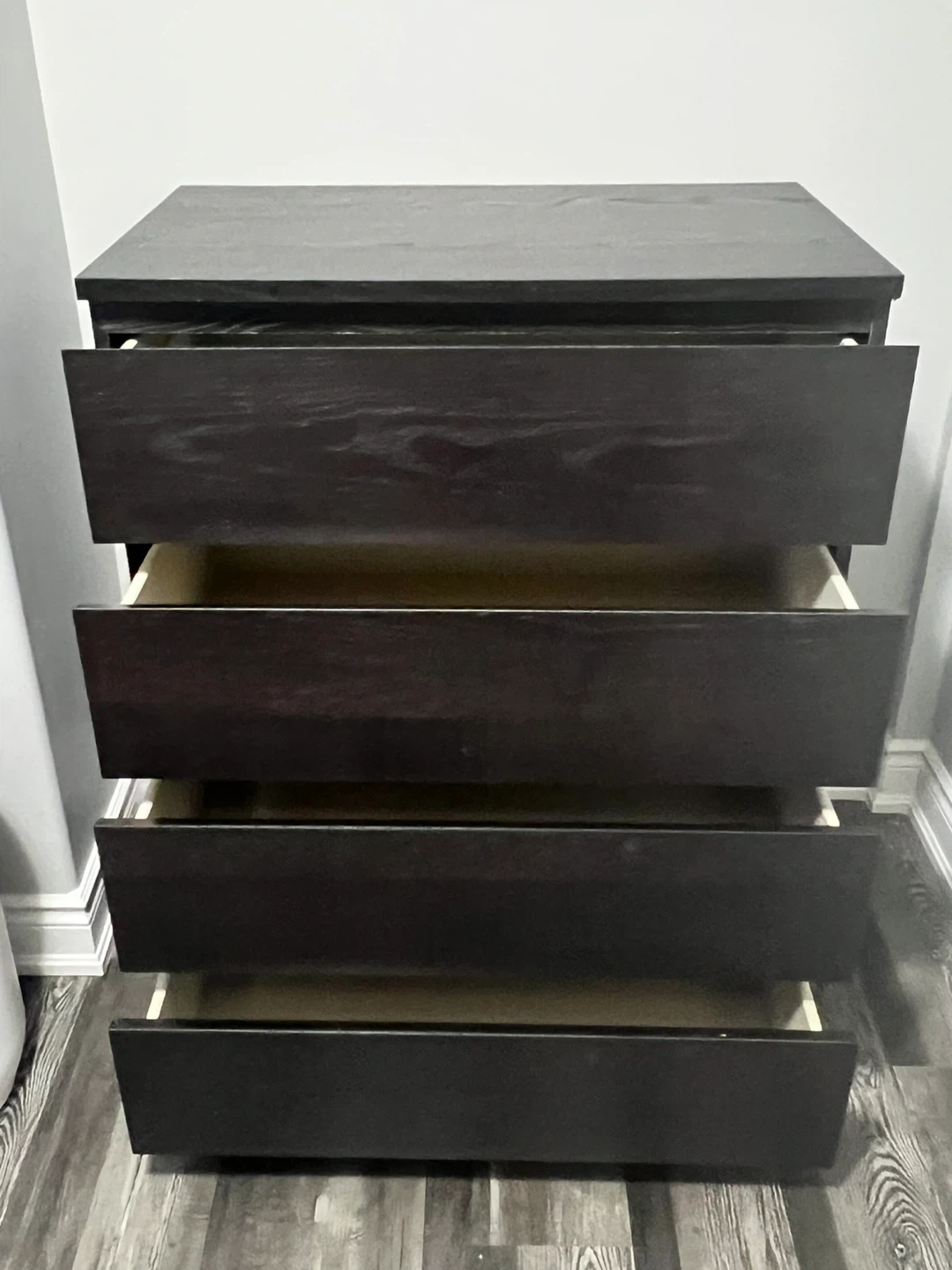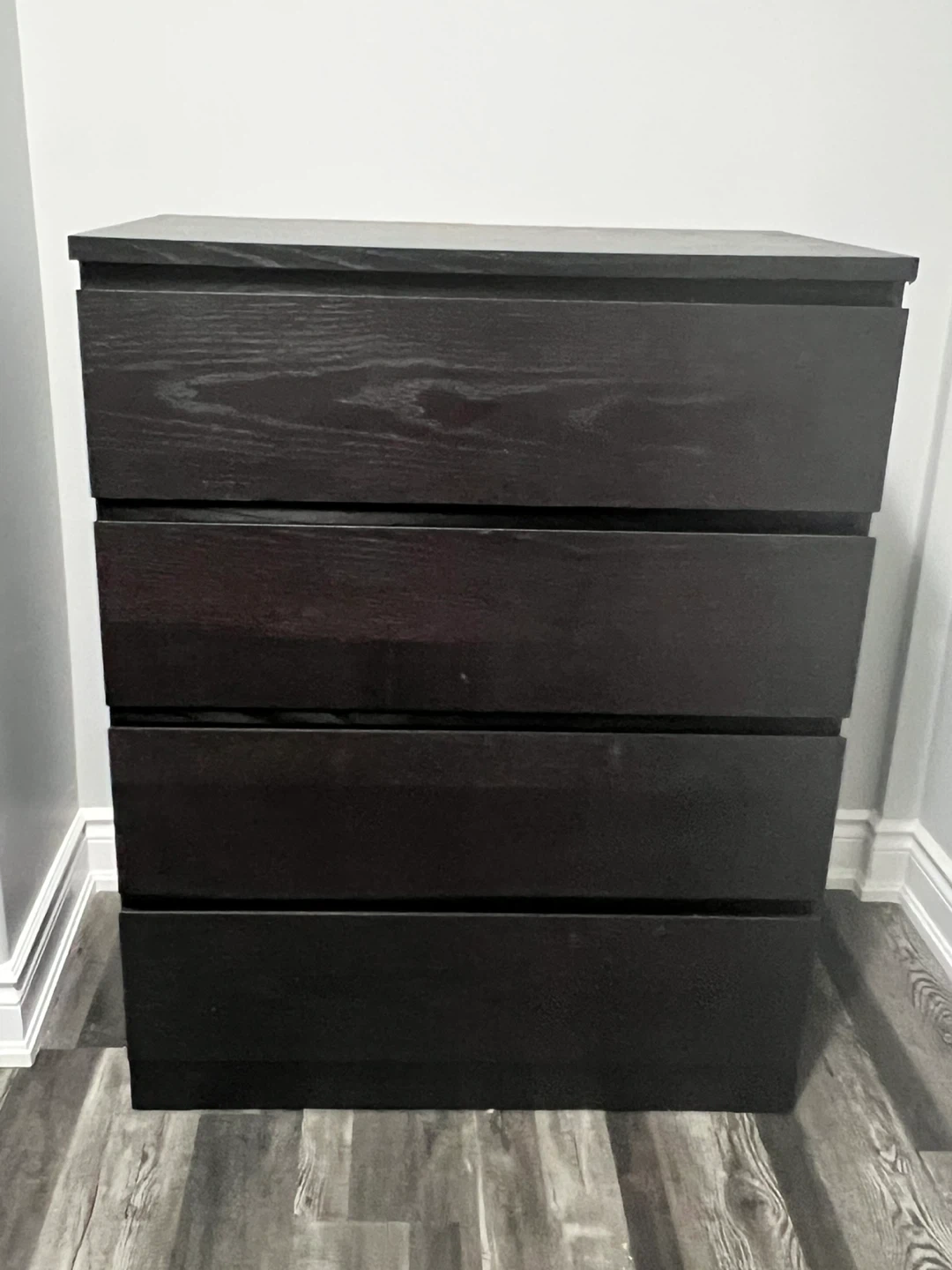 Selling a well-maintained IKEA MALM 4‑Drawer Dresser in dark brown. The dresser is sturdy, spacious, and perfect for organizing clothes or household items. All drawers slide smoothly and provide plenty of storage.