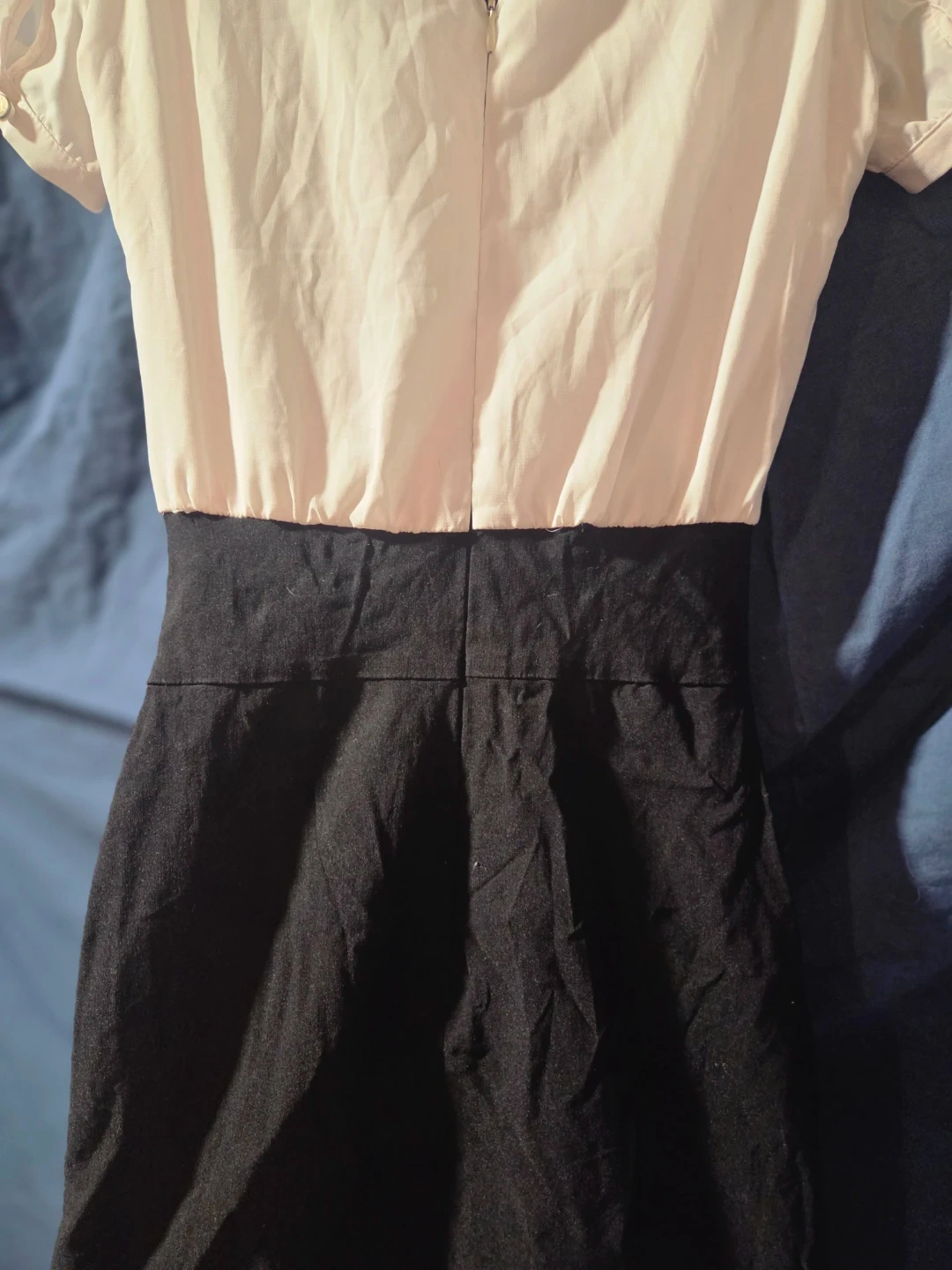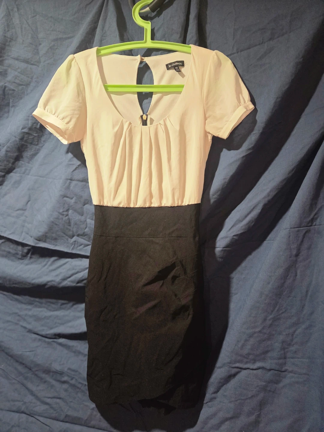 This Le Château dress features a light beige ruched bodice and a black pencil skirt. It's made in Canada. This dress is great for work or a night out!