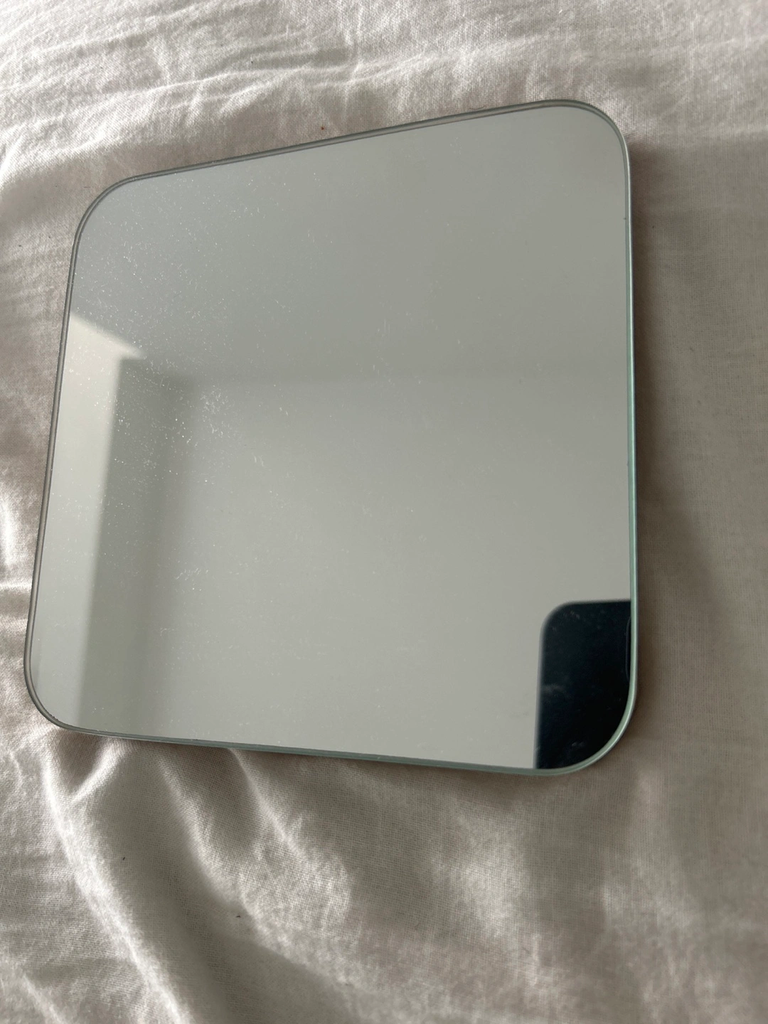 A simple, square mirror. The back is a light wood finish. It has a keyhole for hanging. You could place this mirror in your home to brighten up any space.