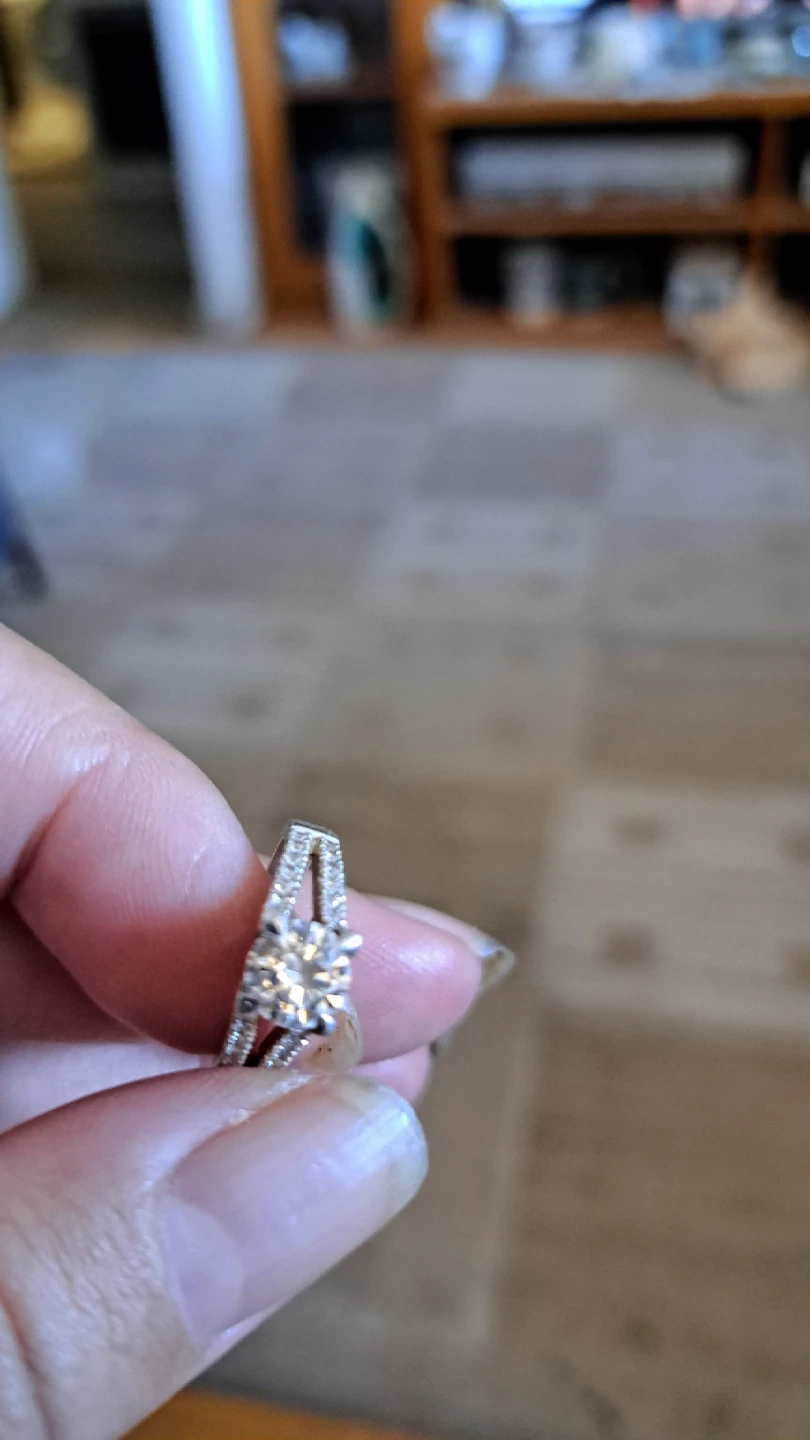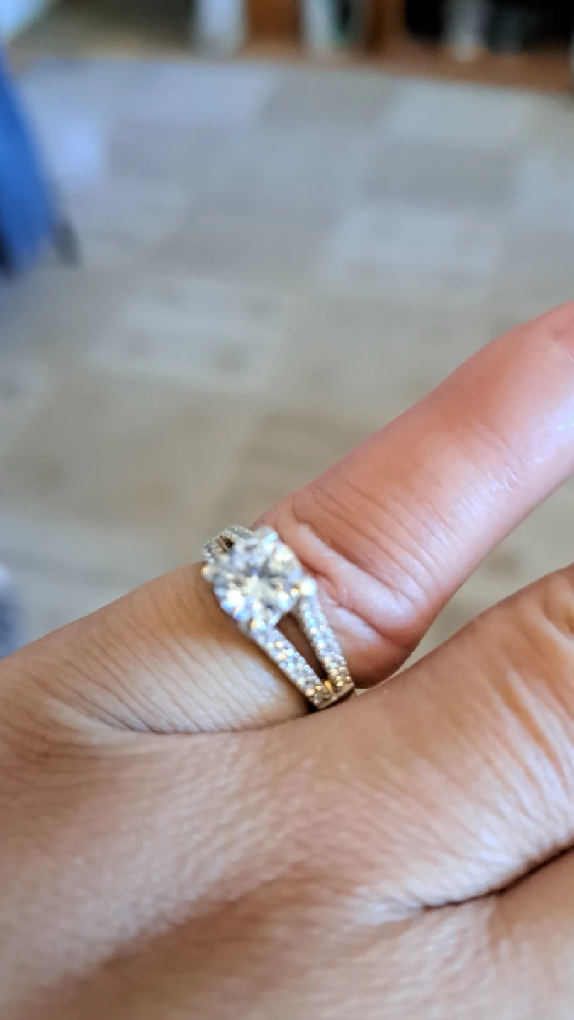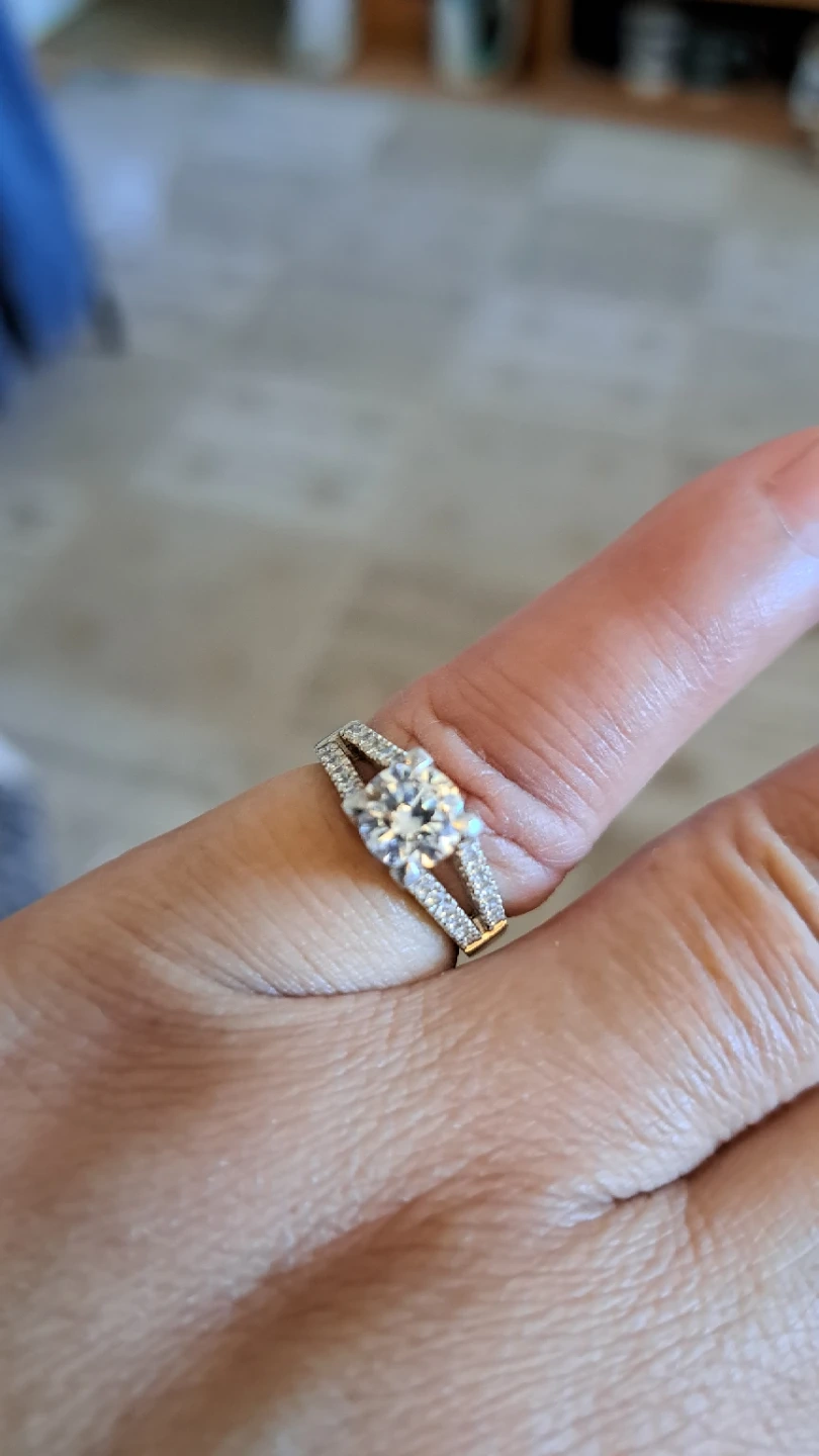 A beautiful engagement ring with a central diamond like and accent stones on the band. It's a split-shank design with a silver-toned metal. It's sure to sparkle!