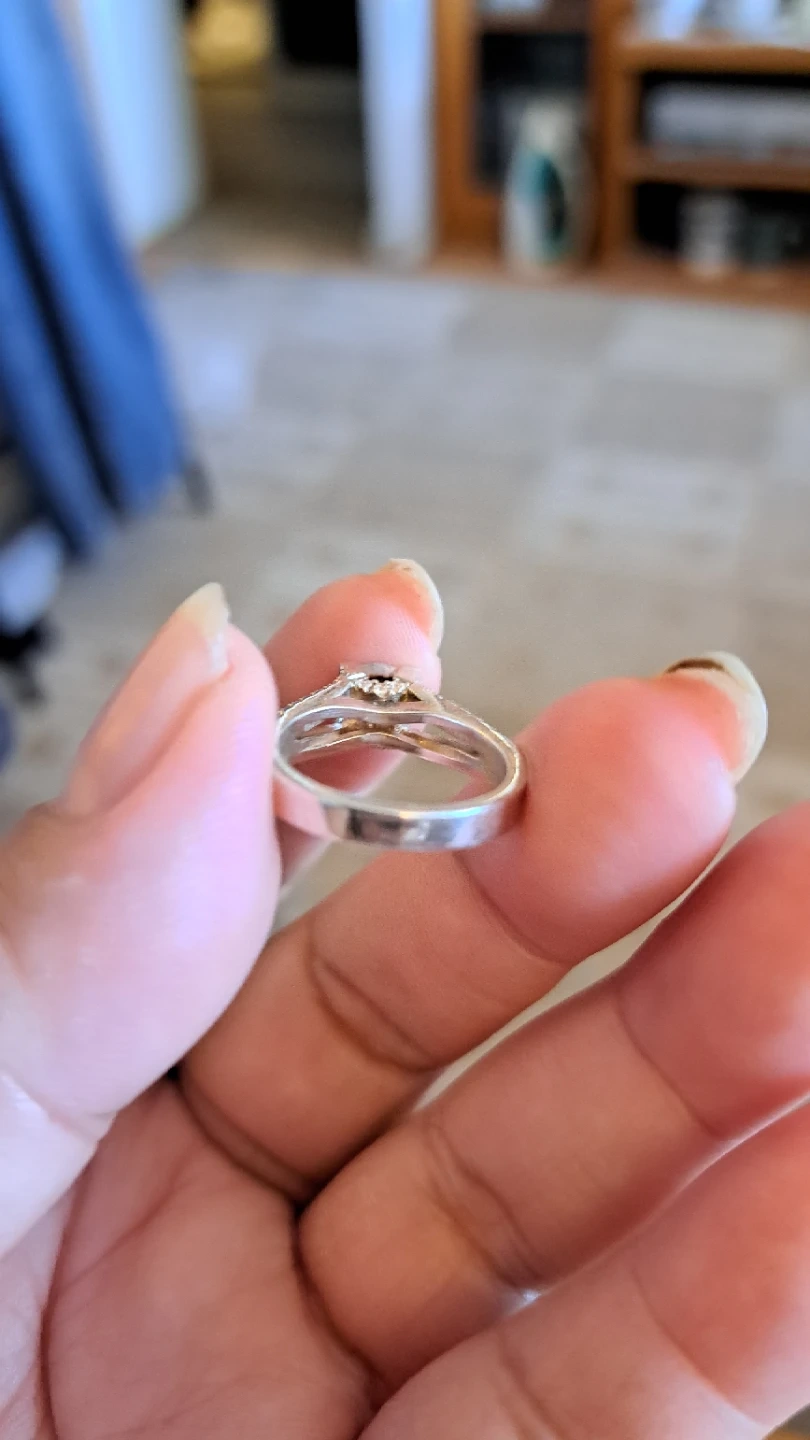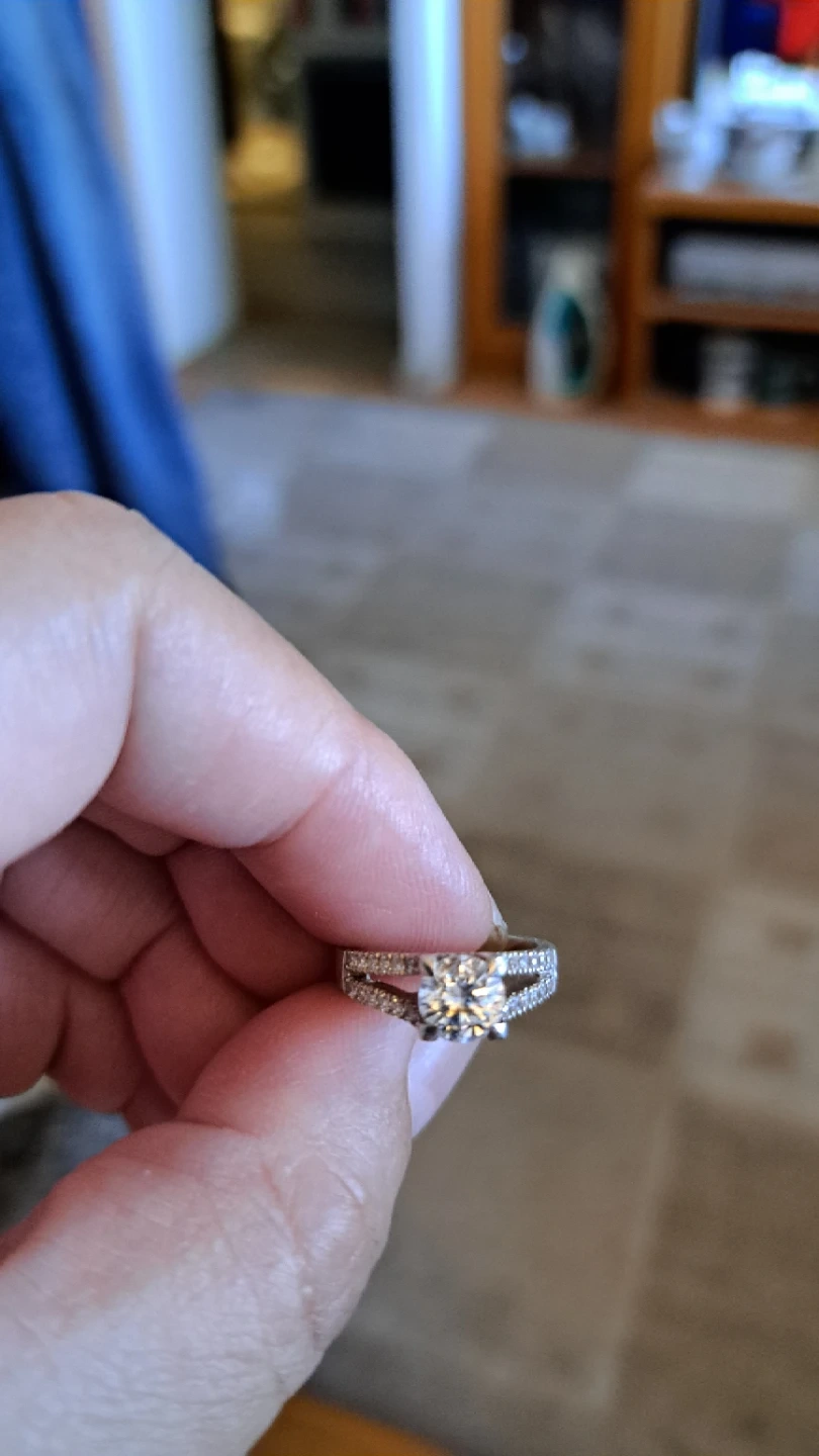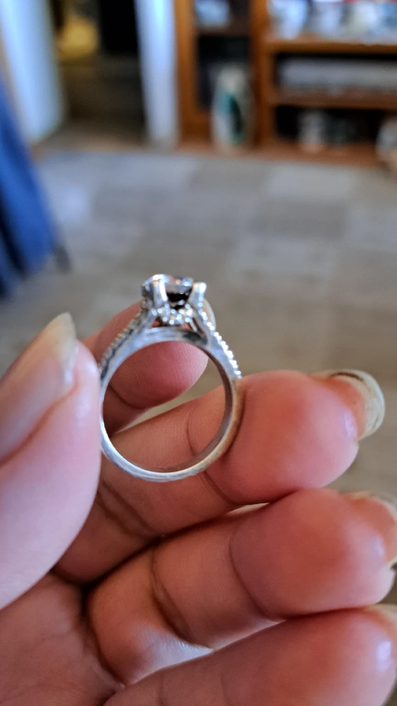 A beautiful engagement ring with a central diamond like and accent stones on the band. It's a split-shank design with a silver-toned metal. It's sure to sparkle!