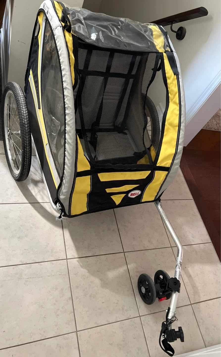 Selling a Bell bike trailer in yellow and black! It's in good condition and ready for your little one to enjoy bike rides with you. Perfect for family outings and adventures