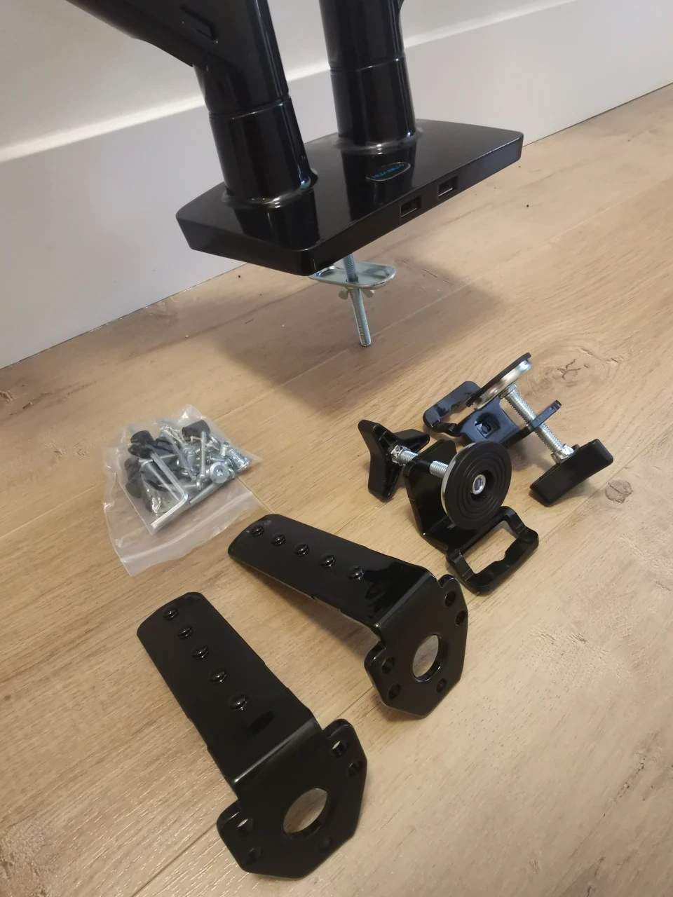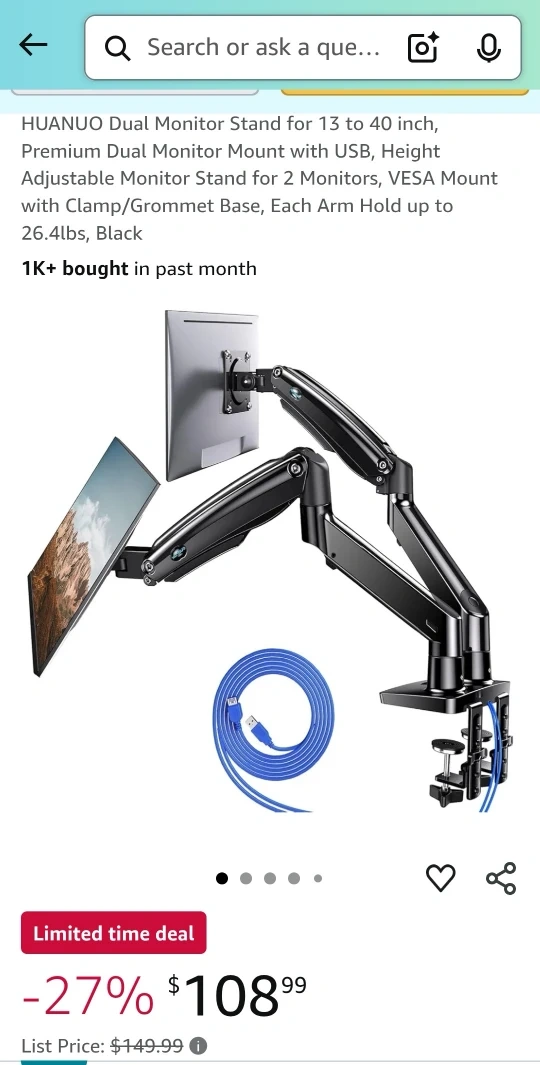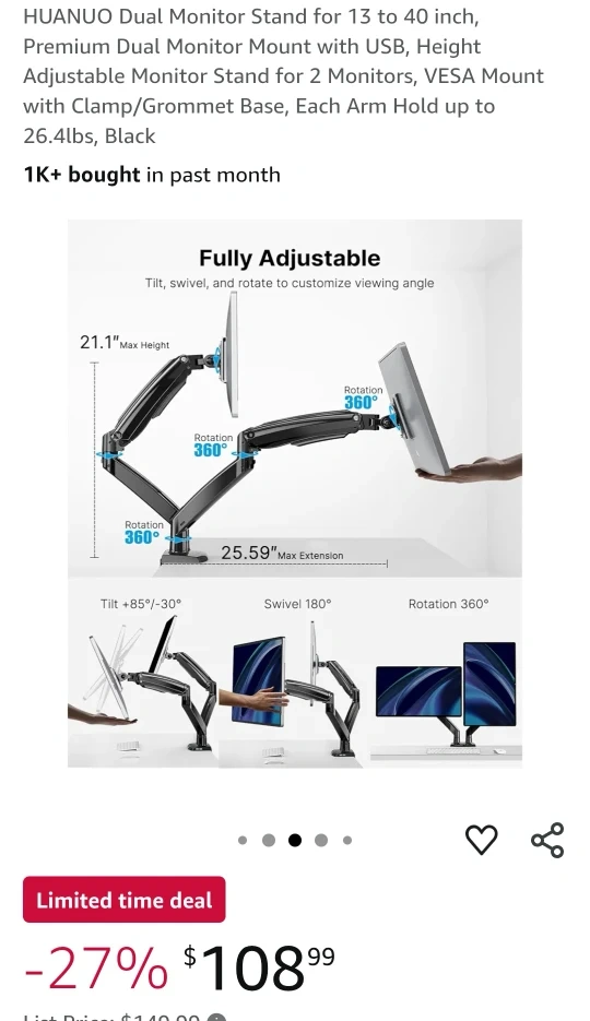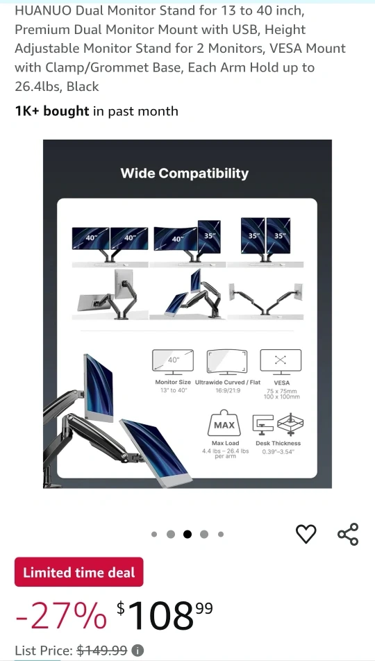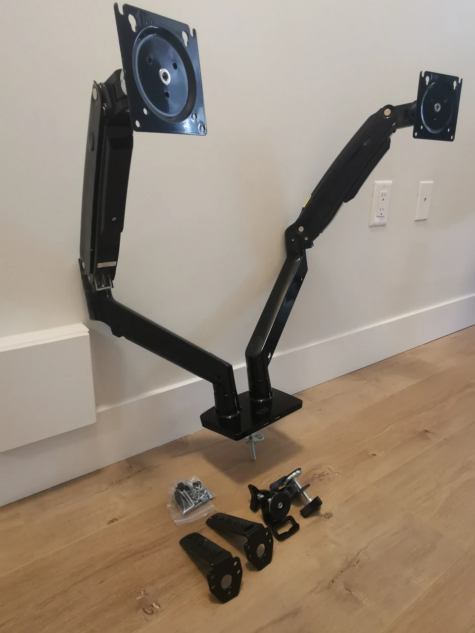 Selling a HUANUO Dual Monitor Mount in excellent condition! It fits monitors from 13 to 40 inches and can hold up to 26.4lbs per arm. The mount is height adjustable and features a VESA mount with a clamp/grommet base. I Originally bought for $150!