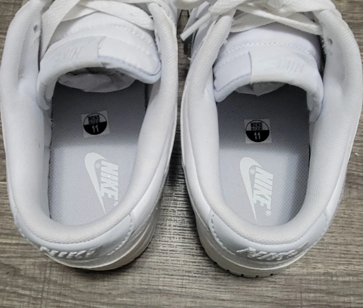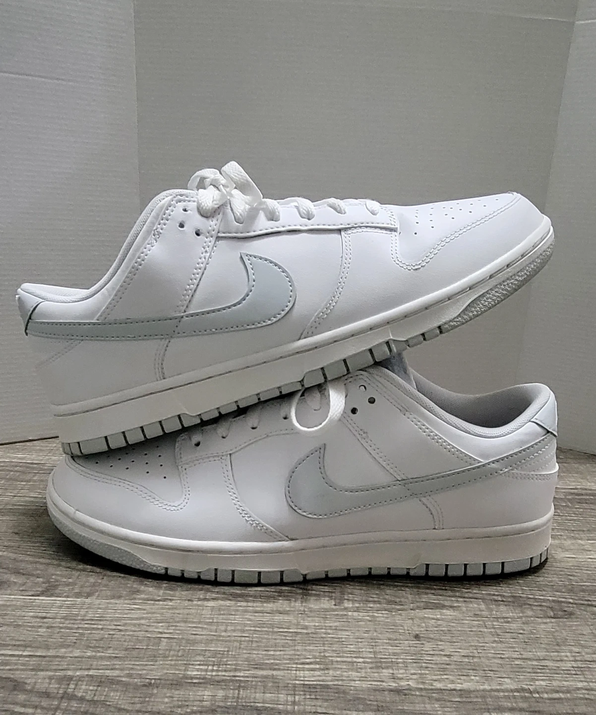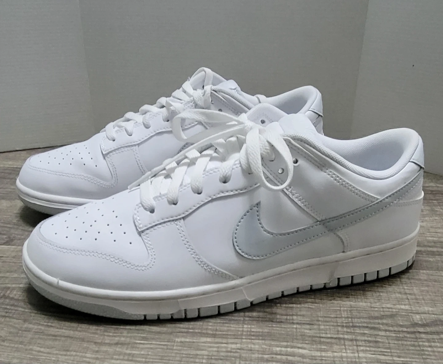 Nike Dunk Low sneakers in white. Men's size 11. Leather and synthetic materials.