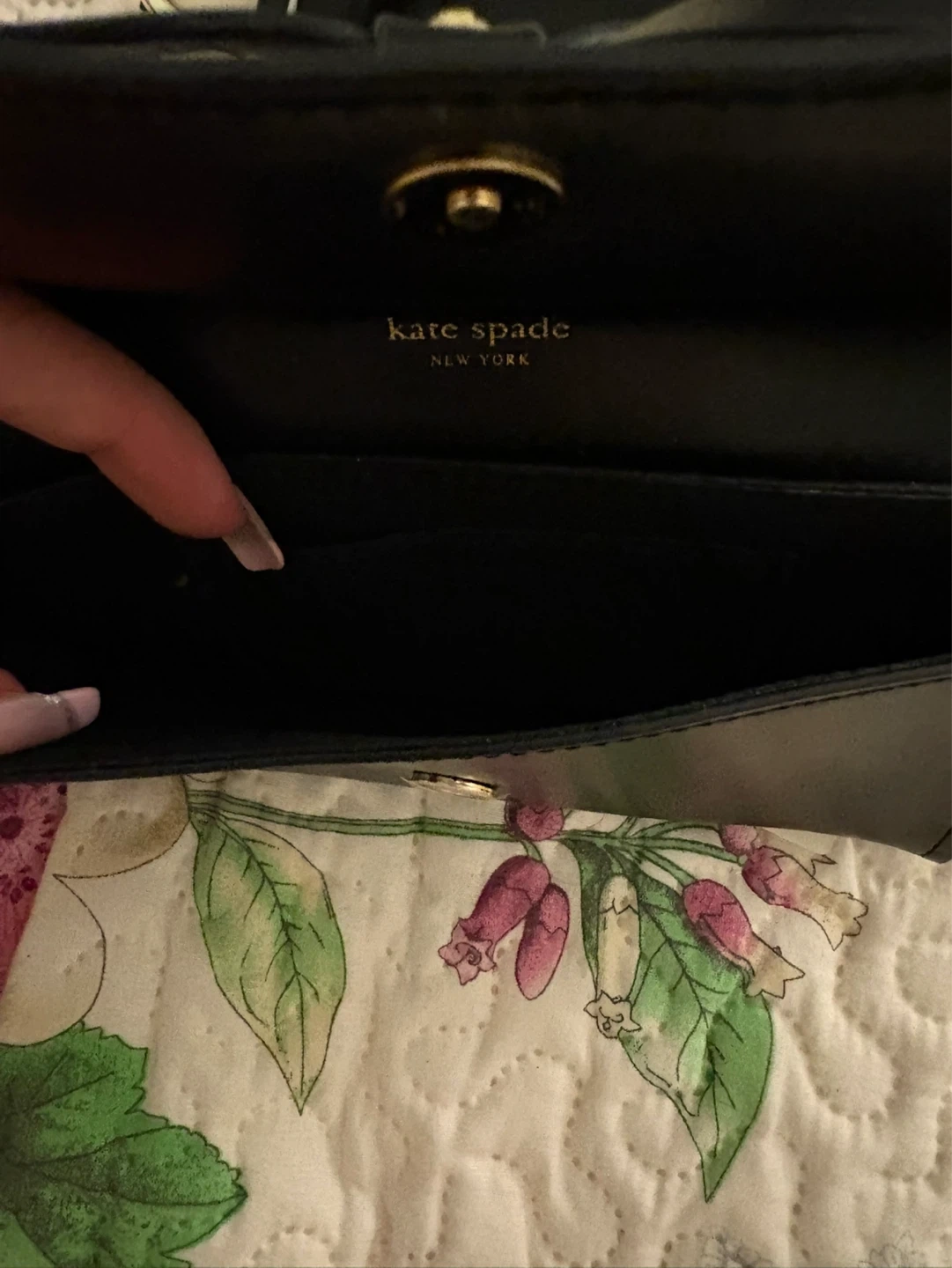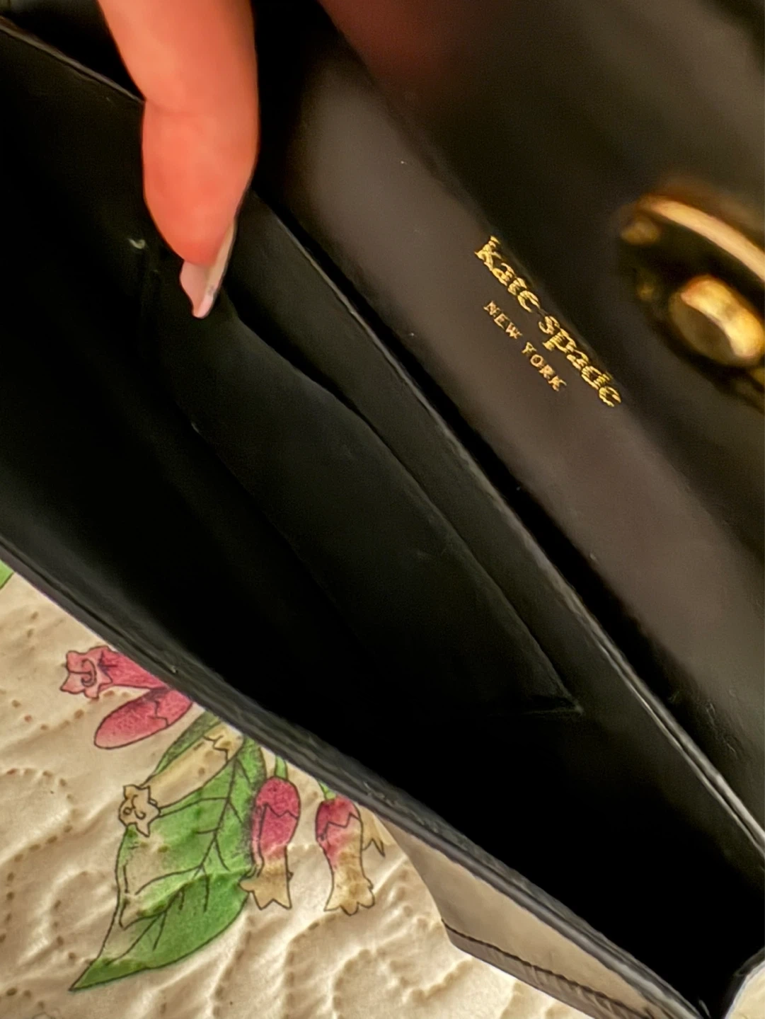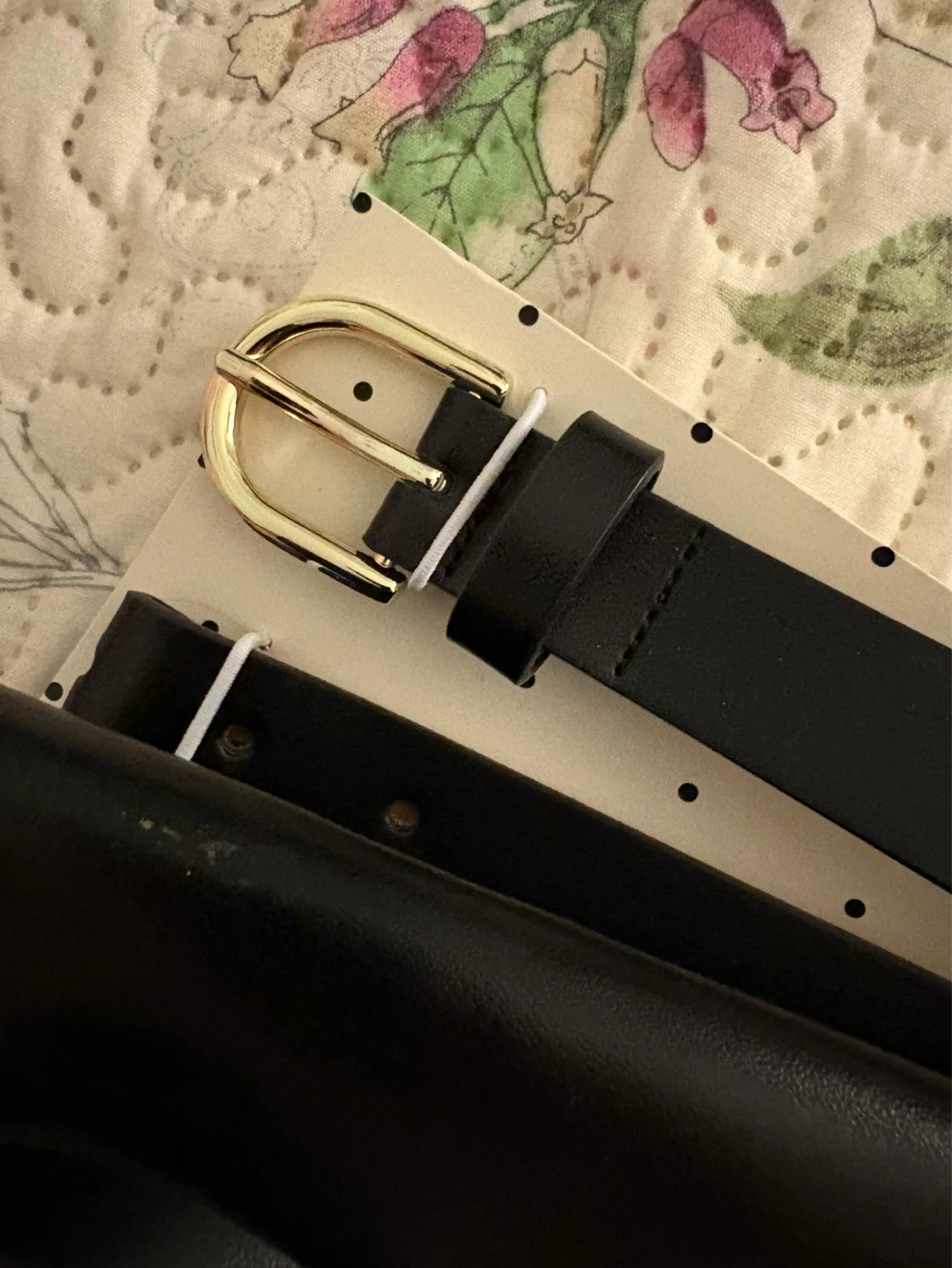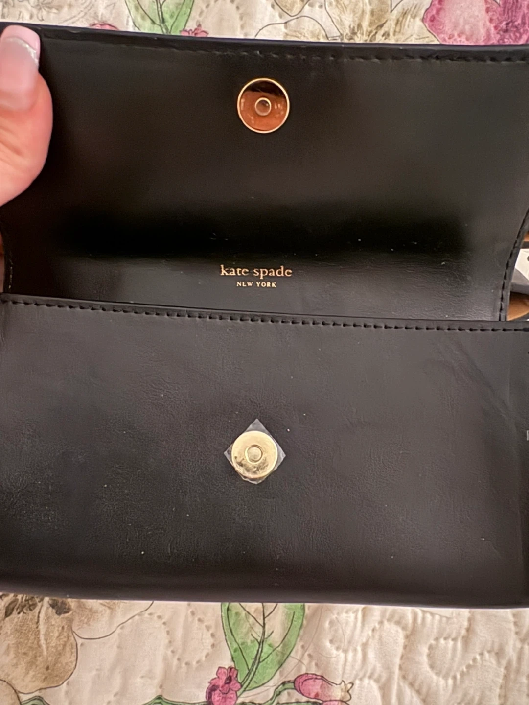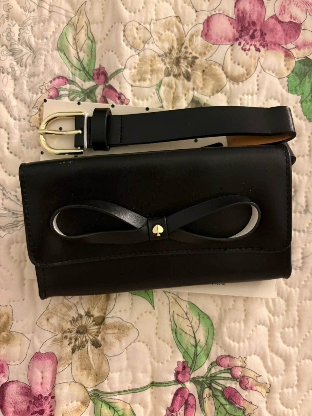 A black Kate Spade wallet featuring a bow detail, and a matching black belt with gold hardware. Perfect for coordinating your accessories!
