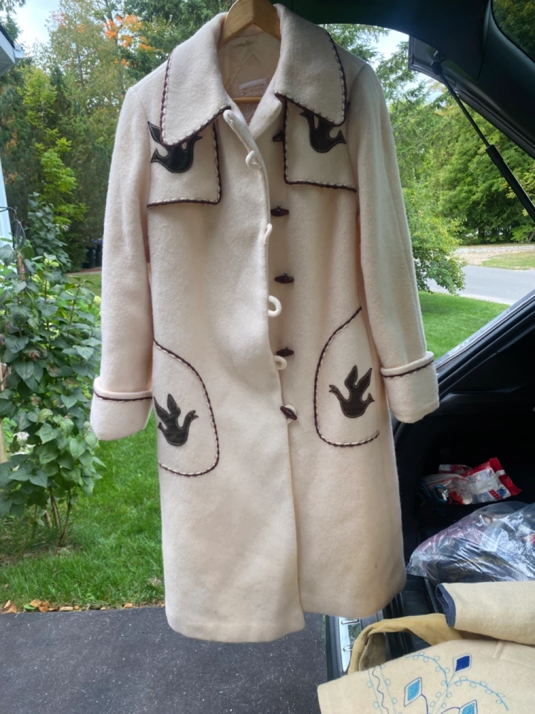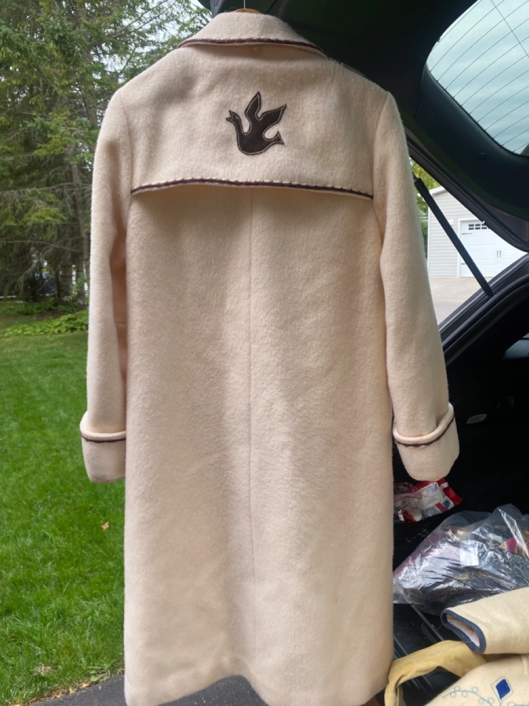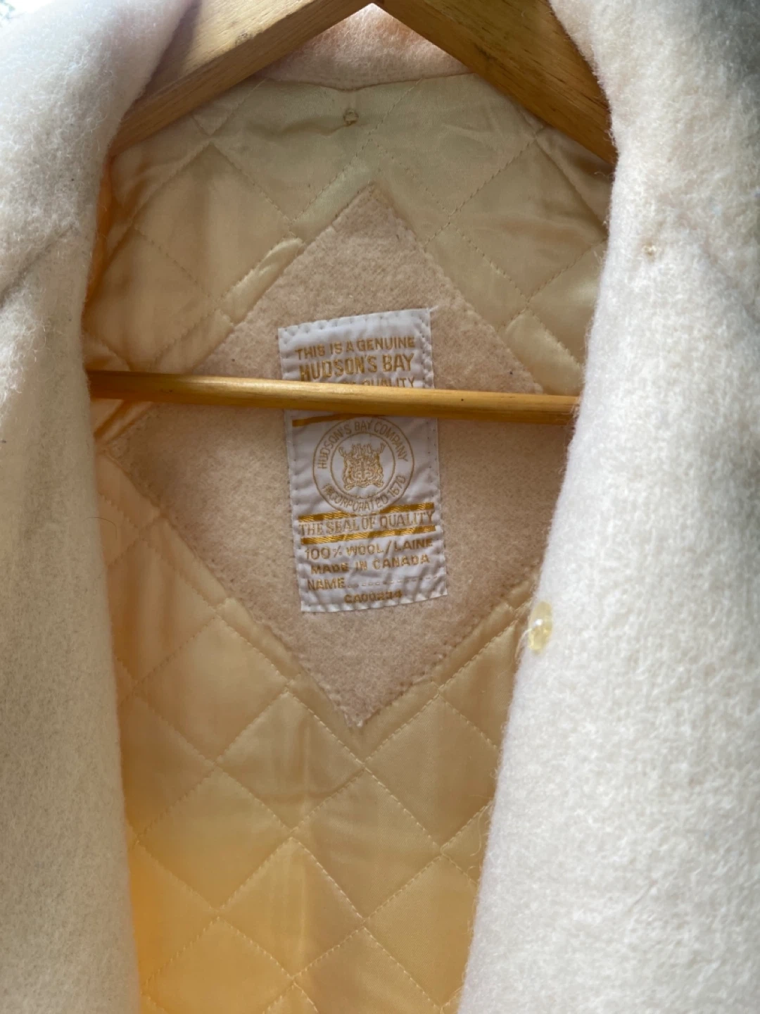 Selling a Hudson's Bay wool coat in excellent condition! This genuine Hudson's Bay coat is made of 100% wool and crafted in Canada. It features a unique bird design on the back and pockets. Perfect for staying warm and stylish during the colder months!