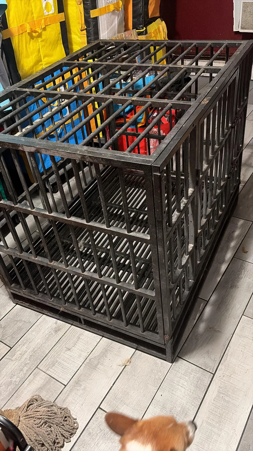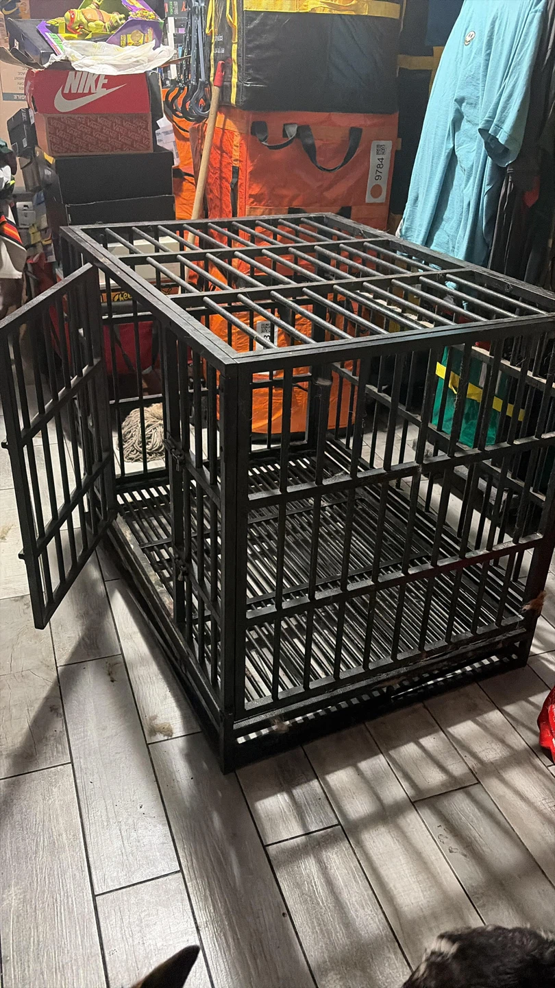 This is a sturdy, metal dog crate built for larger dogs. It features a secure latching system and durable construction. Its spacious design ensures your pet has room to move comfortably.