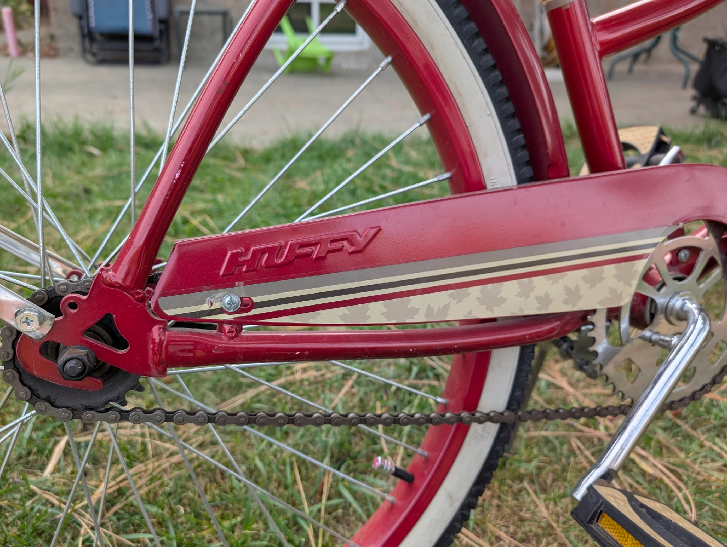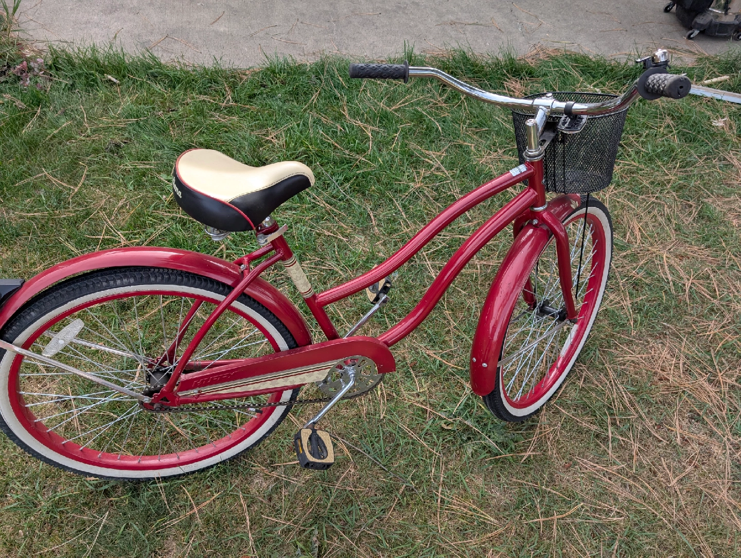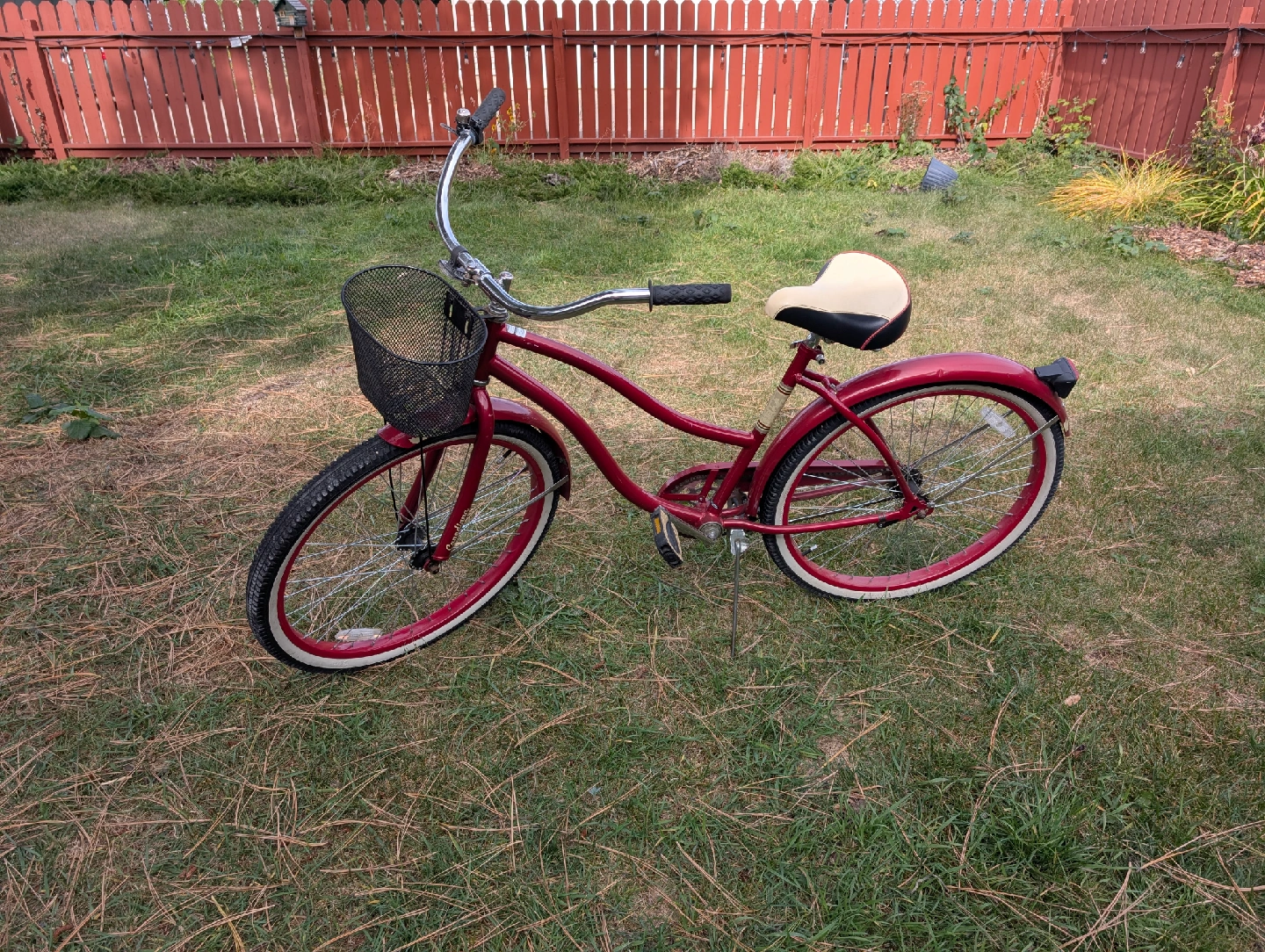 73Selling a Huffy Cranbrook women's cruiser bike in a lovely red colour. It has a front basket for your convenience and a comfortable seat for enjoyable rides around the neighbourhood. The tires are sized at (57-559) 26x2.125, and it's in great shape for leisurely cruising!