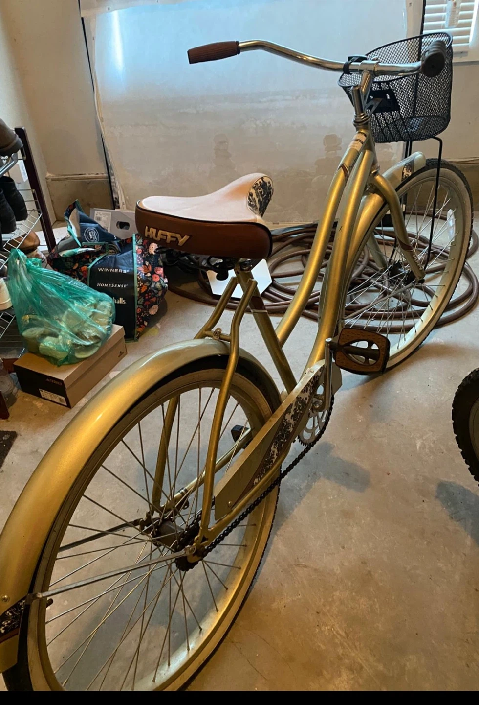 Selling a Huffy cruiser bike in a lovely gold colour! It has a basket in the front, perfect for carrying groceries or a picnic. The seat is brown and cream-coloured. It's been well-loved and ready for a new owner!