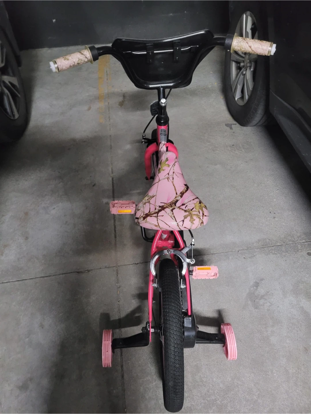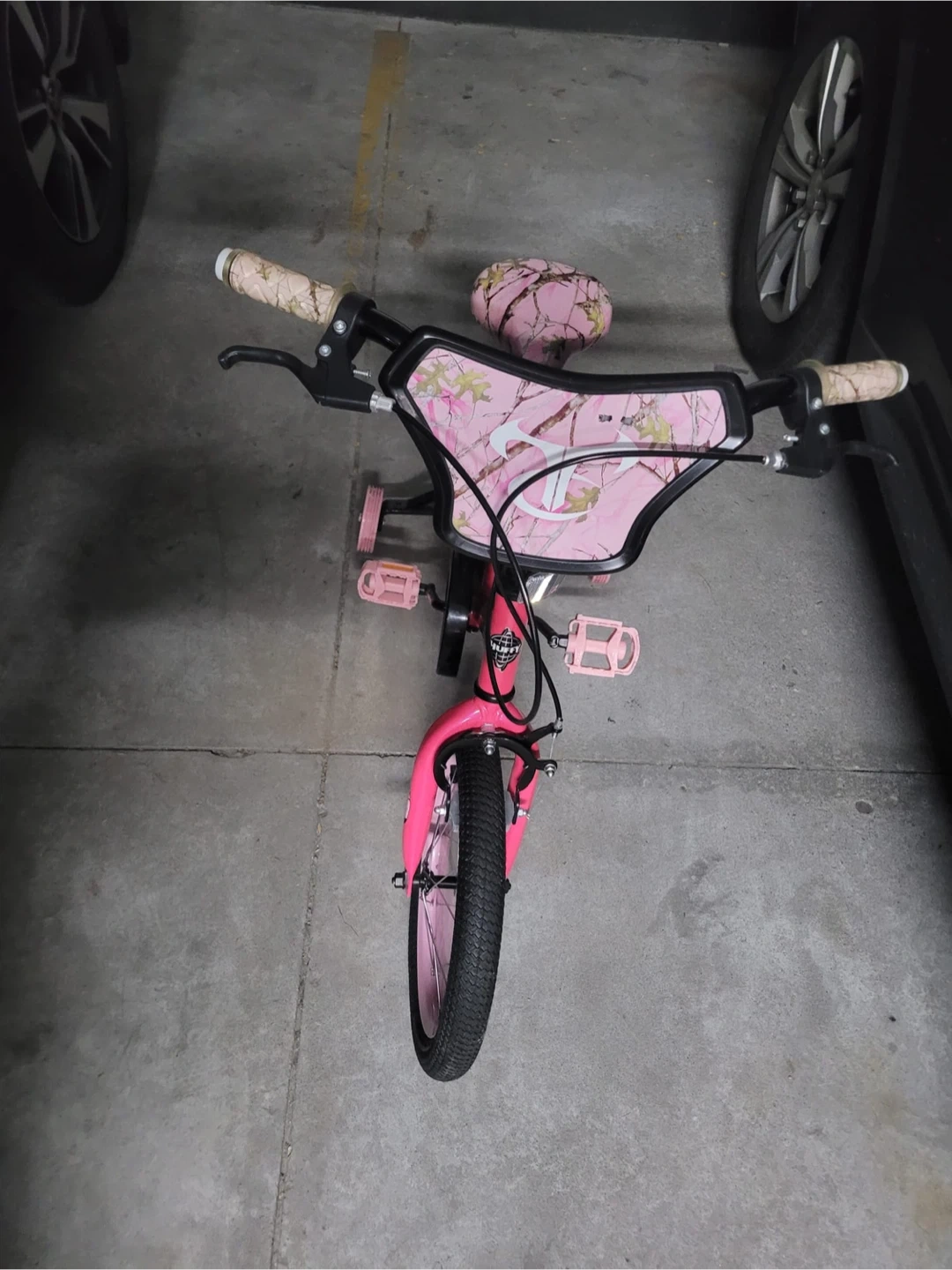 Selling a Huffy girls' bike in a fun pink camo pattern! It's perfect for learning to ride, and the training wheels are included. The bike is in great shape and ready for a new owner.