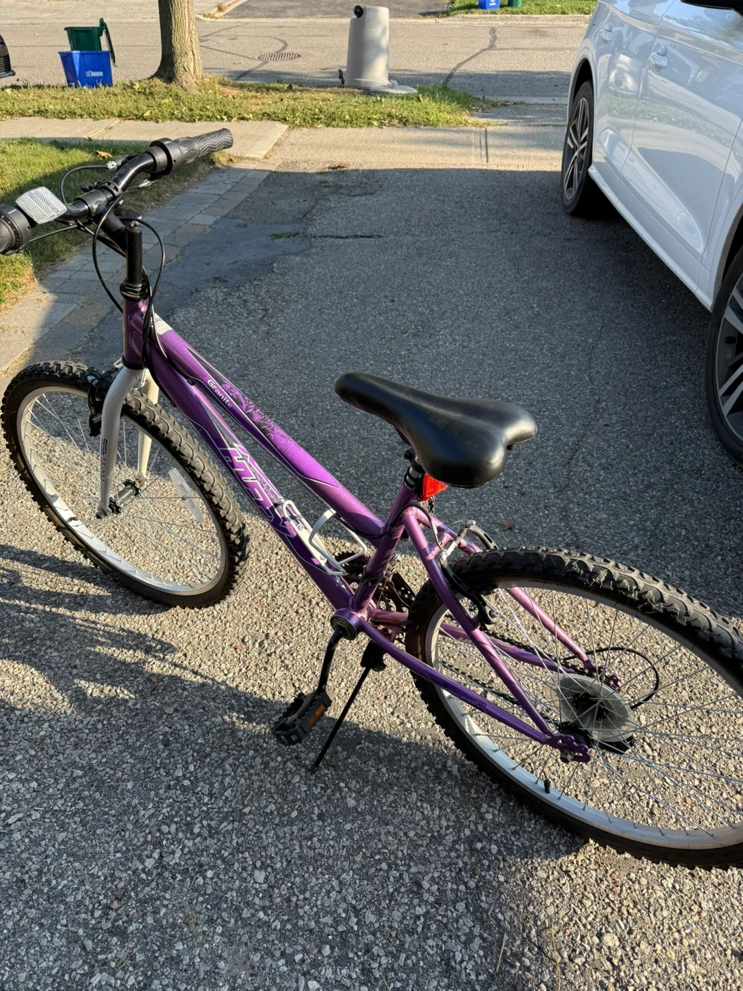 Selling a Huffy Granite girls' bike in purple! It's in good condition and ready for some fun rides. Perfect for a young cyclist looking for adventure