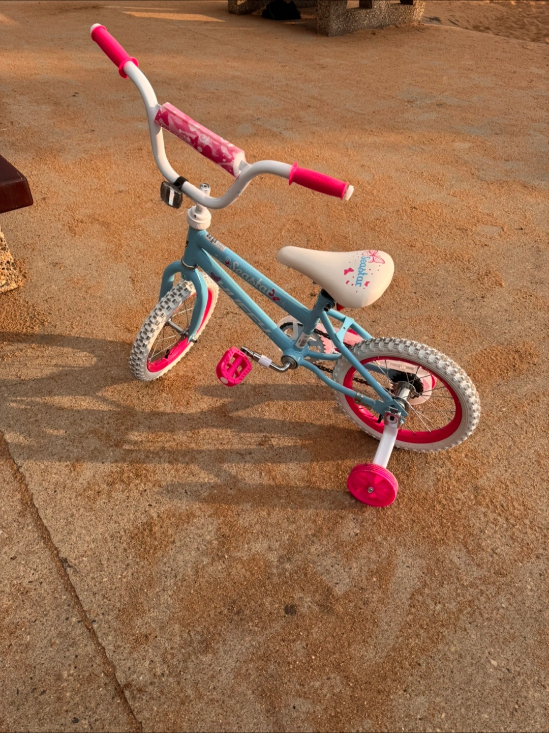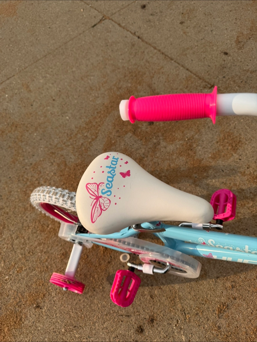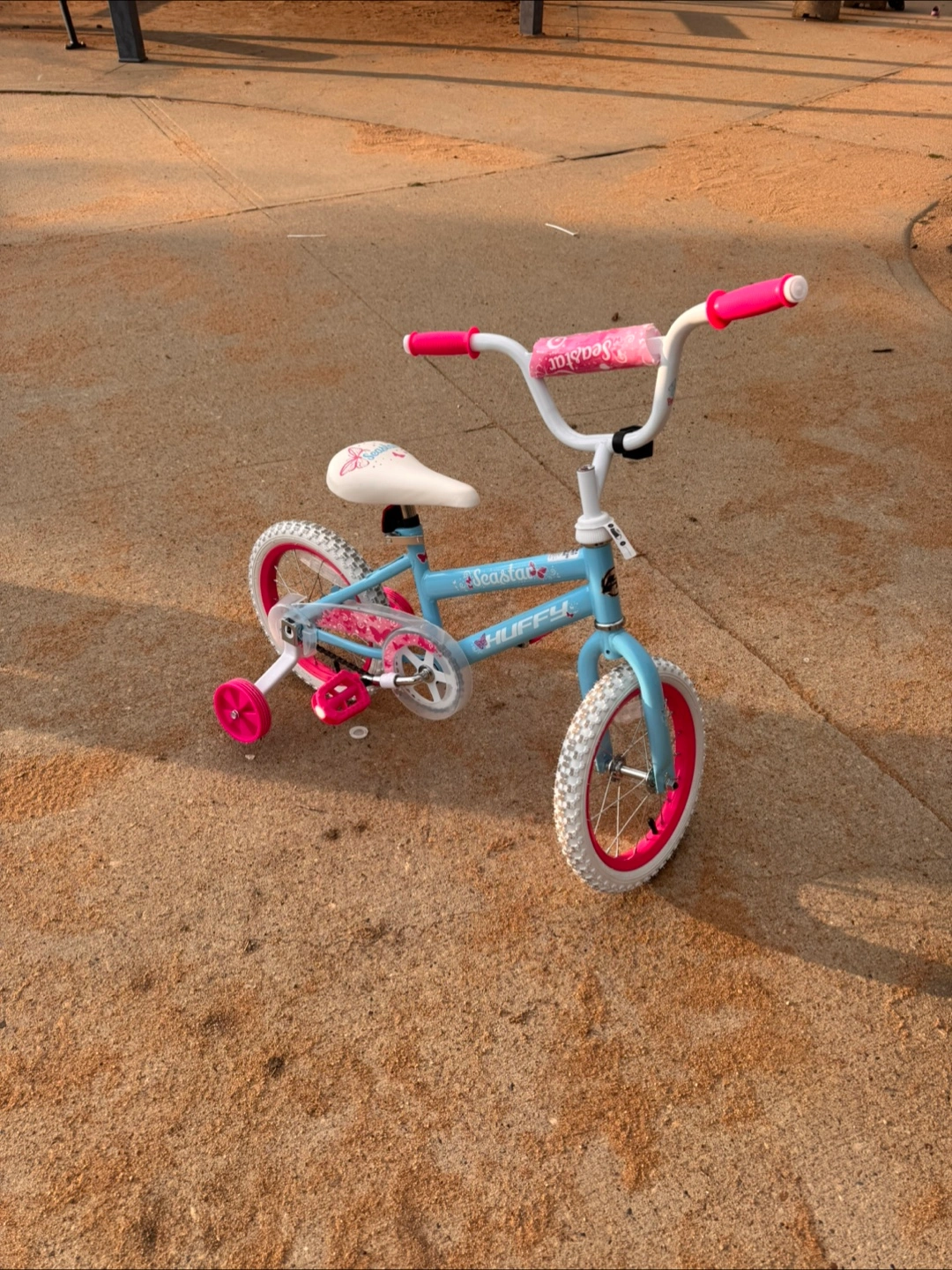 Selling a Huffy Sea Star girls bike in great condition! It's a cute little bike with 12-inch wheels, perfect for a young child learning to ride. The bike features a light blue frame with pink accents and a butterfly design on the seat. Training wheels are included! Bought about 10 days ago