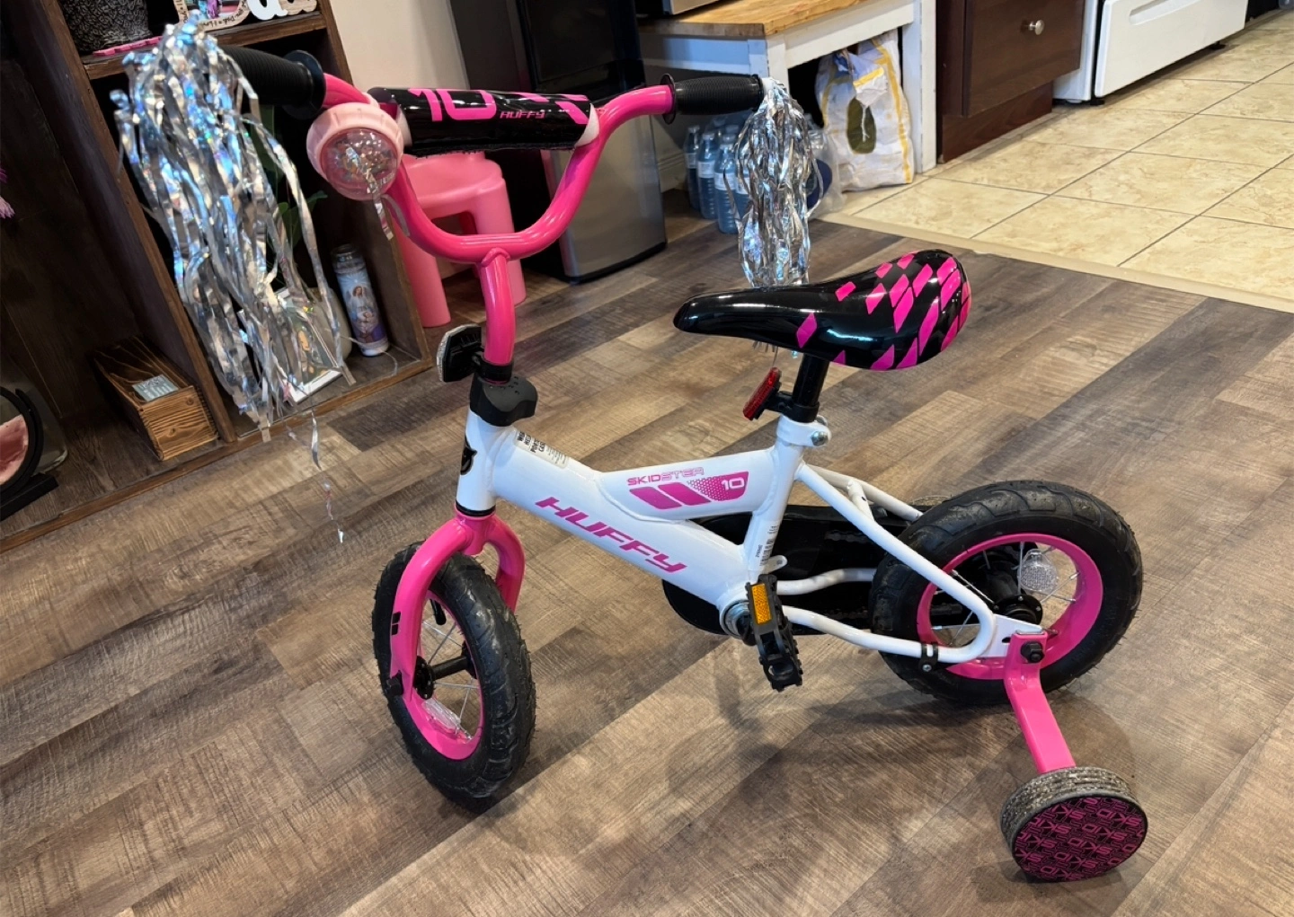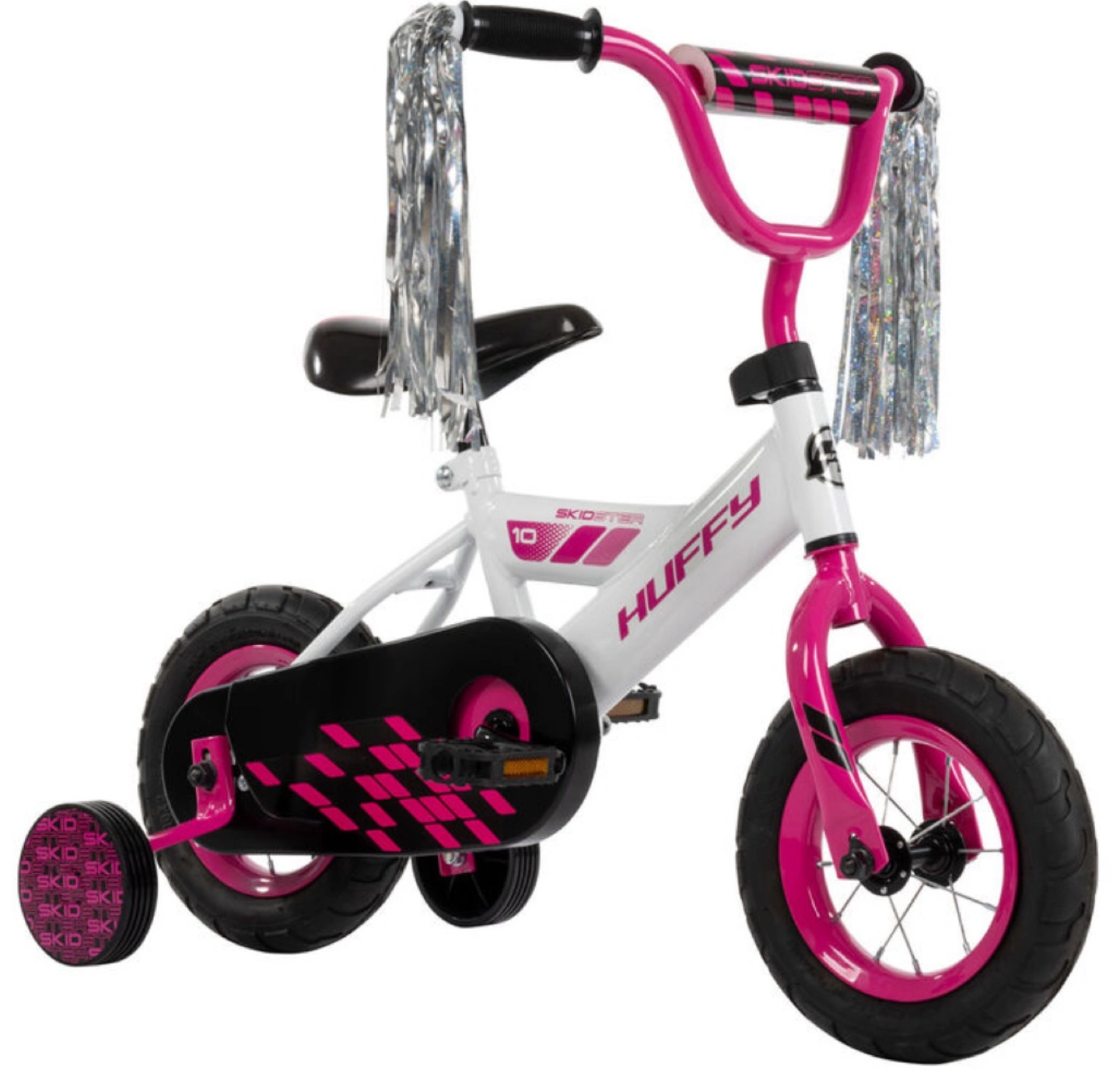 76Selling a Huffy Skidster 10-inch bike in white and pink! It's in great shape and ready for a new rider. Perfect for little ones learning to balance and pedal. Comes with training wheels for extra stability.