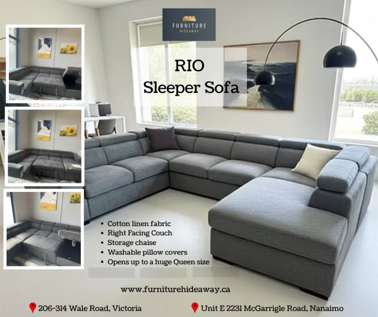 20More room for everyone! Experience ultimate comfort with RIO Sleeper Sofa.🛋️ *Warranty included* Feel free to visit our showroom: 📍Victoria: Unit 206-314 Wale Rd Colwood Phone: 250-858-5164 Open daily: ⏰Mon-Friday: 11am-7pm ⏰Weekends: 10am-6pm 📍Nanaimo: Unit E -2231 Mcgarrigle Rd, Nanaimo Phone : 778-700-8382 ⏰Monday- CLOSED ⏰Tuesday to Sunday: 10am-6pm www.furniturehideaway.ca