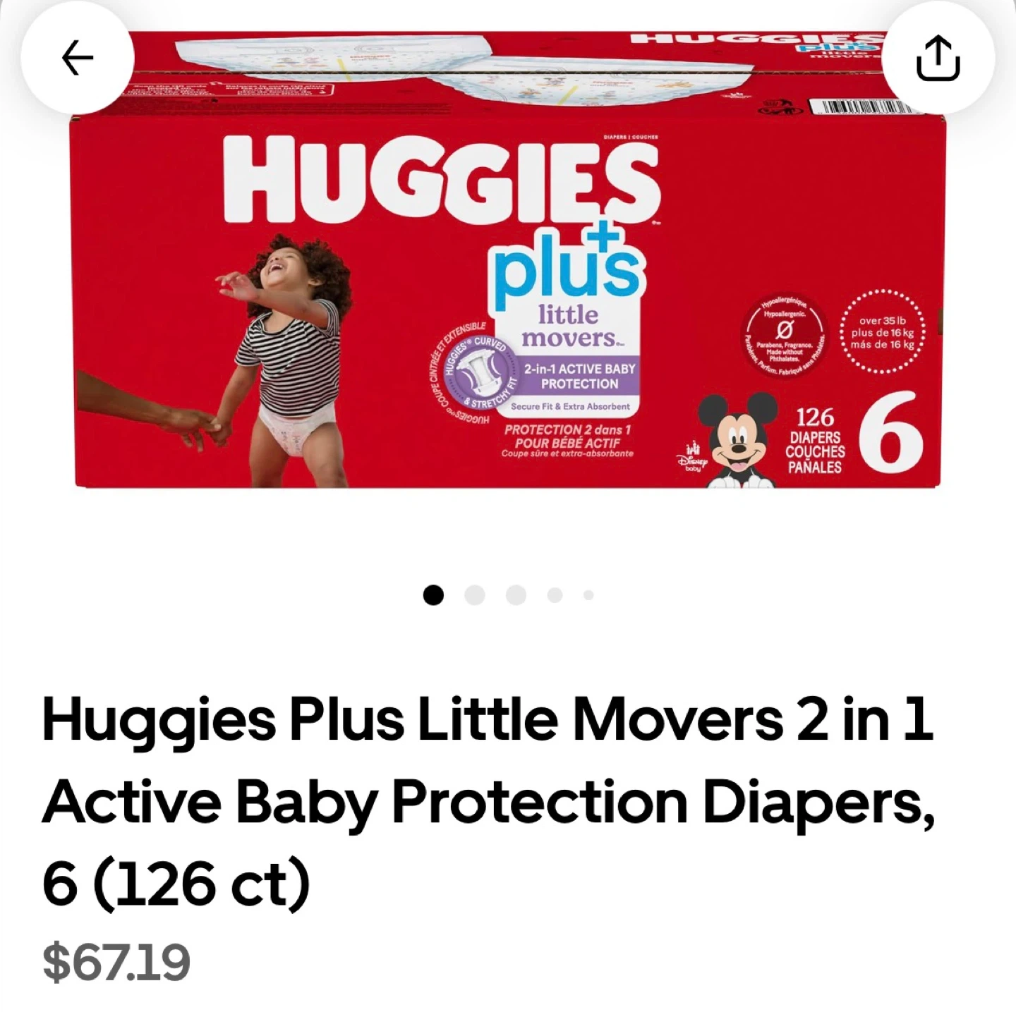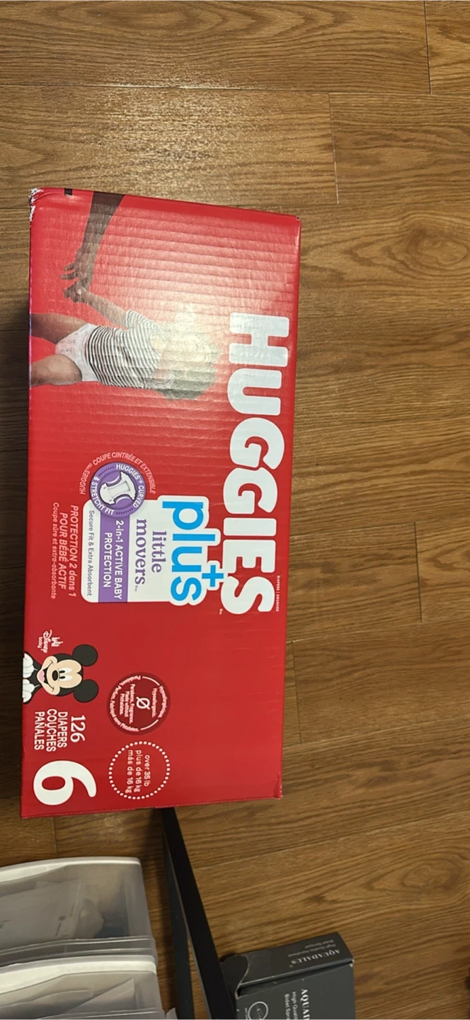 9Selling a box of Huggies Plus Little Movers diapers in size 6. The box contains 126 diapers, offering 2-in-1 active baby protection. Secure fit and extra absorbent. Originally bought for $67.19.