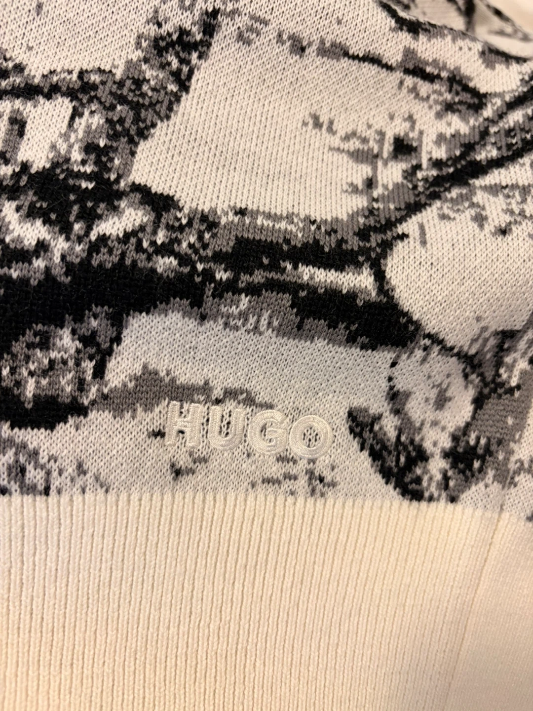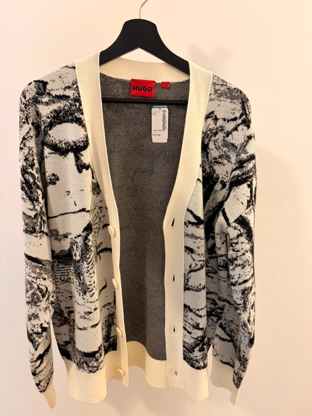 Selling a HUGO cardigan in size P/S. It features a unique black and white print. Originally bought for $299