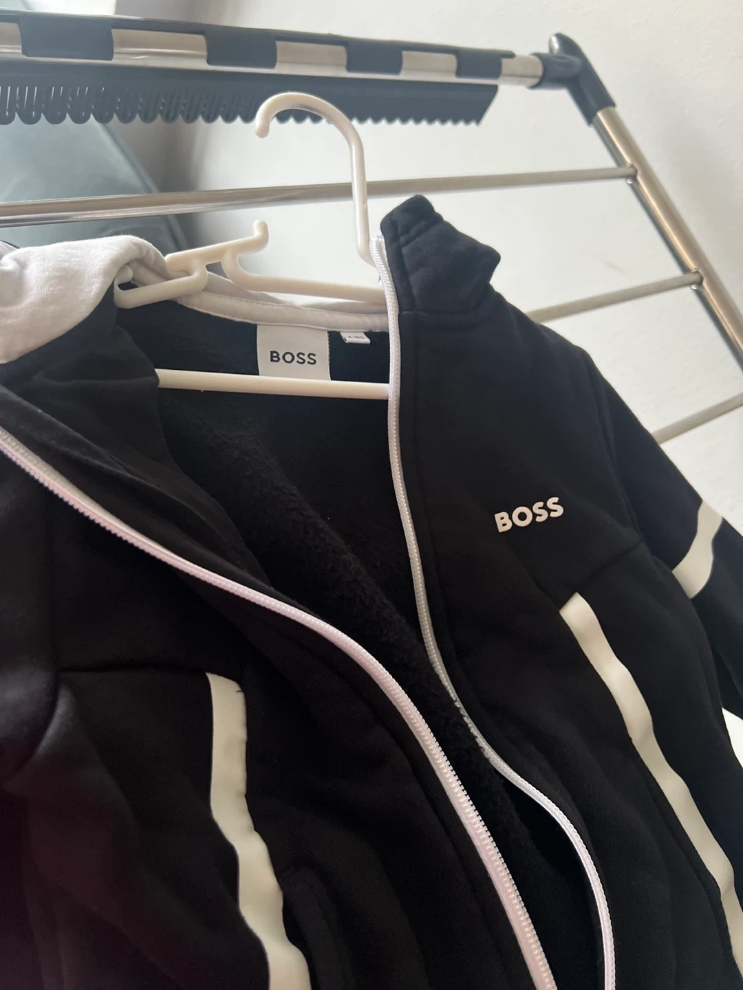 65A Hugo Boss kids tracksuit in black. It includes a zip-up hoodie and matching pants. The set features the BOSS logo and white stripe detailing. Perfect for keeping your little one comfy and stylish!